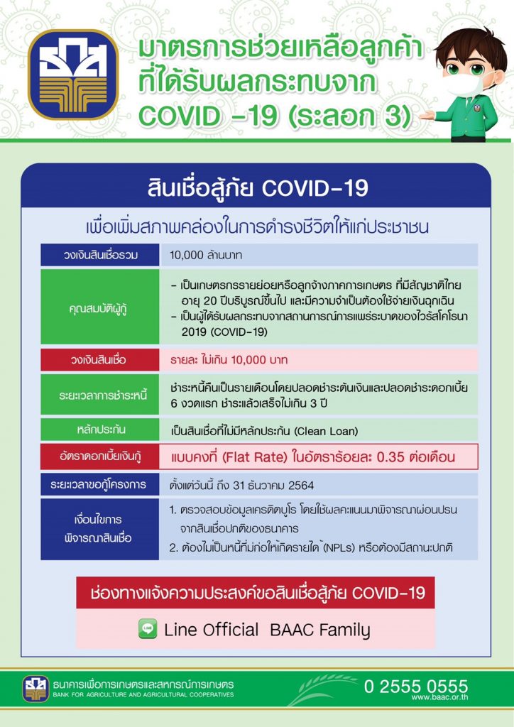 นายธนารัตน์ กล่าวเพิ่มเติมว่า ธ.ก.ส. ยังเปิดให้บริการขอสินเชื่อสู้ภัย COVID – 19 สำหรับเกษตรกร ลูกจ้างภาคการเกษตรที่ได้รับผลกระทบจากสถานการณ์ COVID – 19 และเพื่อป้องกันการเป็นหนี้นอกระบบ วงเงินรวม 10,000 ล้านบาท อัตราดอกเบี้ยคงที่ร้อยละ 0.35 ต่อเดือน ปลอดชำระคืนต้นเงินและดอกเบี้ยใน 6 เดือนแรก วงเงินกู้รายละไม่เกิน 10,000 บาท ไม่ต้องใช้หลักประกัน ระยะเวลาชำระคืนไม่เกิน 3 ปี