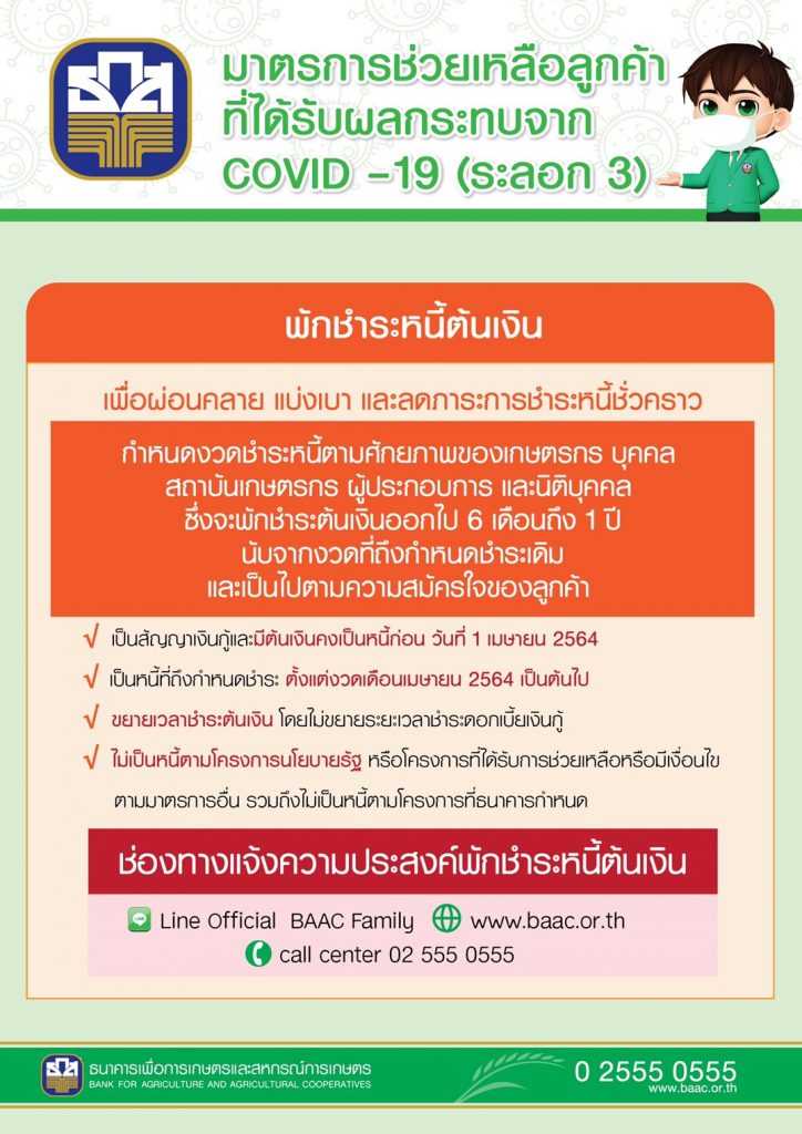 นายธนารัตน์ งามวลัยรัตน์ ผู้จัดการธนาคารเพื่อการเกษตรและสหกรณ์การเกษตร (ธ.ก.ส.) เปิดเผยว่า หลังจากรัฐบาลมอบหมายให้ ธ.ก.ส. ดำเนินโครงการพักชำระหนี้ต้นเงิน ลดผลกระทบจากไวรัส COVID- 19 ระลอกใหม่ ตามความสมัครใจ ธ.ก.ส. จึงได้พักชำระหนี้ต้นเงินให้กับเกษตรกร และบุคคล ผู้ประกอบการด้านเกษตร สหกรณ์การเกษตร กลุ่มเกษตรกร กลุ่มบุคคล กองทุนหมู่บ้านหรือ ชุมชนและองค์กร มีภาระหนี้ก่อนวันที่ 1 เมษายน 2564 และเป็นหนี้กำหนดชำระตั้งแต่งวดเดือนเมษายน 2564 เป็นต้นไป
