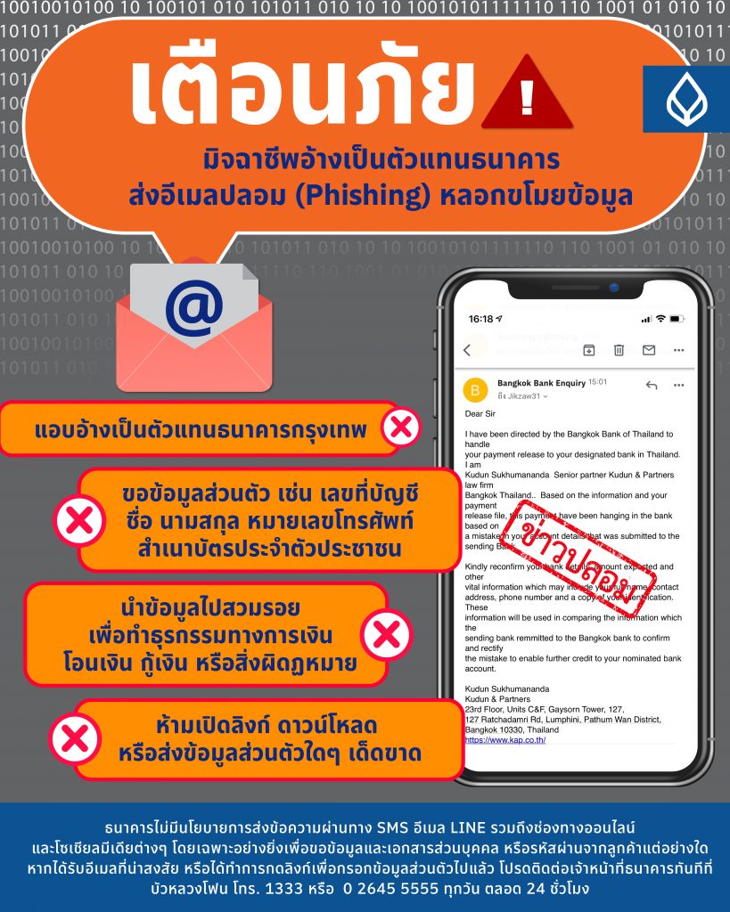 นางปรัศนี อุยยามะพันธุ์ ผู้ช่วยผู้จัดการใหญ่ ธนาคารกรุงเทพ จำกัด (มหาชน) เปิดเผยว่า ปัจจุบันมีกลุ่มมิจฉาชีพได้ใช้วิธีการในรูปแบบต่างๆ หลอกลวง แอบอ้างเป็นธนาคาร เพื่อขอข้อมูลส่วนตัวผ่านทางอินเทอร์เน็ต หรือฟิชชิ่ง (Phishing) เป็นจำนวนมาก โดยมักใช้วิธีส่งข้อความ SMS หรืออีเมล เพื่อสร้างความเข้าใจผิดให้ลูกค้าและหลอกลวงเอาข้อมูลส่วนตัวลูกค้าเข้าไปทำรายการแก้ไข เพื่อใช้ยืนยันการทำธุรกรรม โดยล่าสุดใช้วิธีส่ง SMS แจ้งว่าได้รับเงินจากจากธนาคารพร้อมให้กดเพิ่มเป็นเพื่อนใน LINE เพื่อหลอกขอข้อมูลส่วนตัว และการส่งข้อความผ่านช่องทางอีเมล โดยในข้อความมิจฉาชีพจะอ้างตัวเป็นตัวแทนที่ได้รับมอบอำนาจจากธนาคารในการดูแลธุรกรรมการชำระเงินที่เกิดความผิดพลาดให้ลูกค้า เพื่อหลอกลวงให้ลูกค้ายืนยันข้อมูลส่วนตัวพร้อมแนบสำเนาบัตรประชาชนสำหรับดำเนินการแก้ไขรายการดังกล่าว ซึ่งจะทำให้มิจฉาชีพสามารถสวมรอยเข้าไปทำธุรกรรมการเงิน โดยเฉพาะการโอนเงินออกจากบัญชีด้วยการใช้ข้อมูลที่ลูกค้าให้ผ่านวิธีการหลอกลวงแอบอ้างในรูปแบบ ฟิชชิ่งนี้