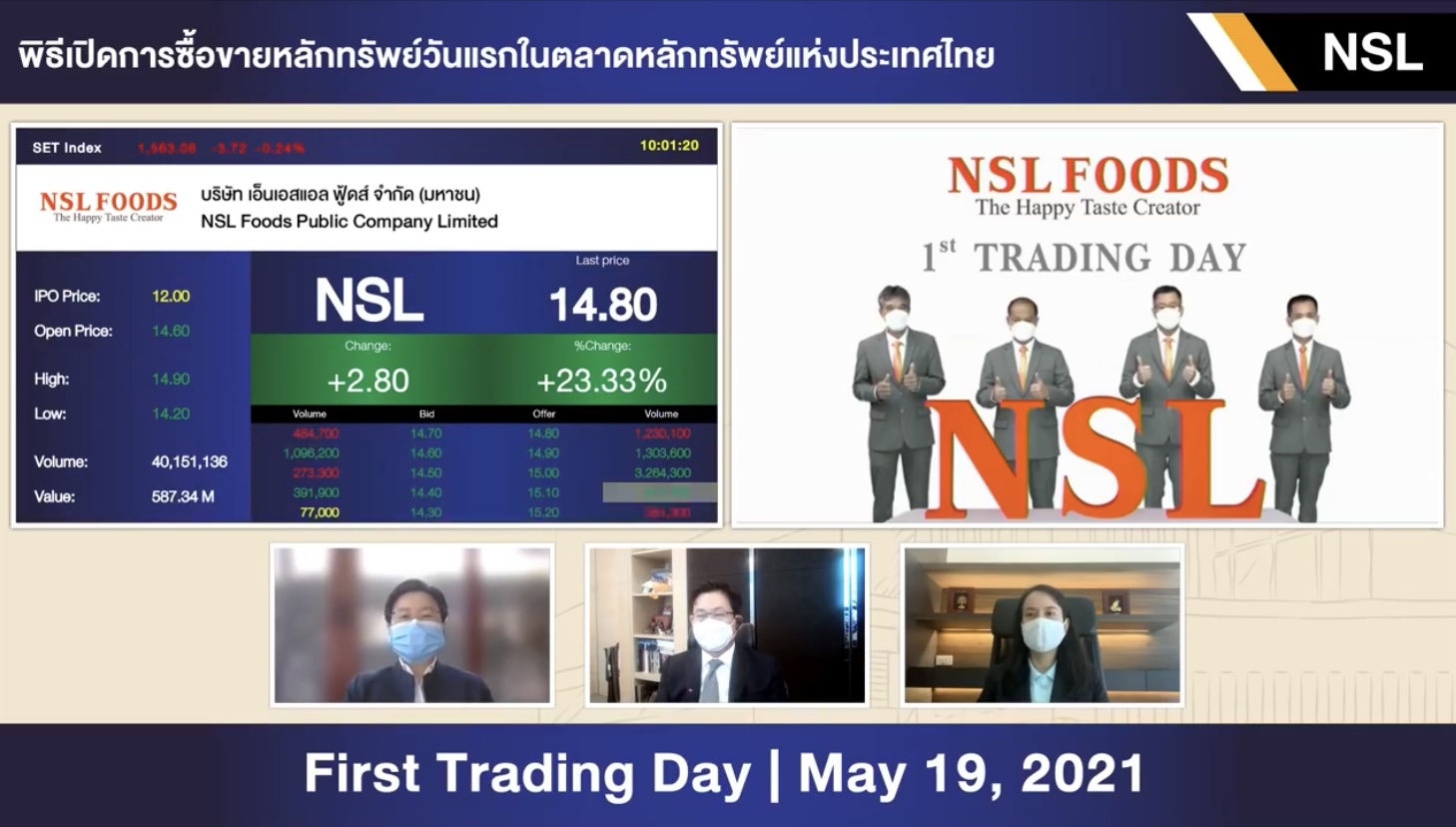 กรุงเทพฯ 19 พ.ค. – หุ้น NSL เปิดเทรดวันแรกที่ 14.60 บาท เพิ่มขึ้น 2.60 บาท (+21.67%) จากราคาขาย IPO ที่ 12.00 บาท/หุ้น