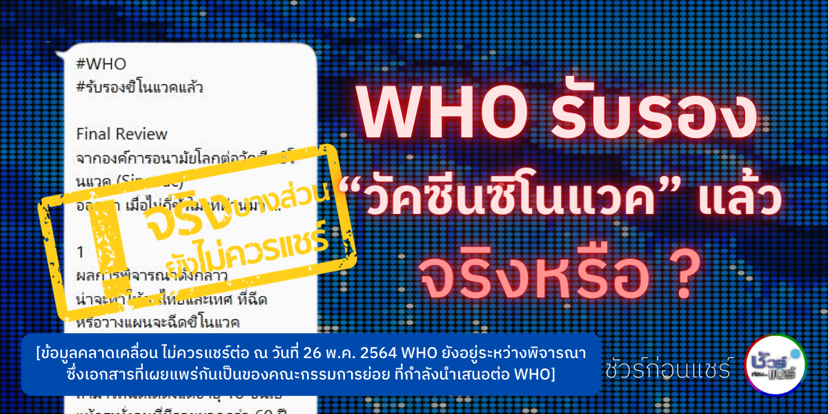 ศูนย์ชัวร์ก่อนแชร์ สำนักข่าวไทย อสมท ตรวจสอบ ณ วันที่ 26 พฤษภาคม 2564 พบว่า องค์การอนามัยโลก (WHO) ยังอยู่ระหว่างการพิจารณาเพื่อรับรองวัคซีนซิโนแวค แต่ยังไม่ถึงกำหนดเวลาลงมติรับรอง