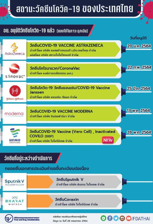 สำนักข่าวไทย 28 พ.ค.- อย. อนุมัติทะเบียนวัคซีน COVILO (BIBP) ของ Sinopharm ที่นำเข้าโดย บริษัท ไบโอจีนีเทค จำกัด แล้ววันนี้ โดยวัคซีนนี้เป็นแบบชนิดเชื้อตาย กำหนดให้ใช้ 2 เข็มห่างกัน 21-28 วันโดยนับเป็นการขึ้นทะเบียนวัคซีนเป็นลำดับที่ 5 ในไทย