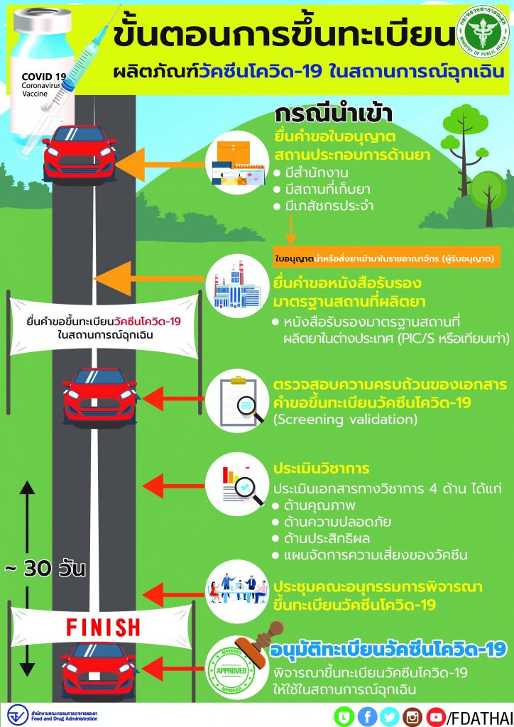 สำหรับการขึ้นทะเบียนวัคซีนโควิด-19 ในไทยนั้น มุ่งเน้นเพื่อให้ได้วัคซีนที่ปลอดภัย มีคุณภาพ และมีประสิทธิผลให้คนไทยได้ใช้ ซึ่งการขึ้นทะเบียนจะเป็นแบบใช้ในภาวะฉุกเฉิน โดยขั้นตอนในการนำเข้า ผู้นำเข้าต้องยื่นคำขอใบอนุญาตสถานประกอบการด้านยา เพื่อเป็นผู้รับอนุญาตนำเข้า พร้อมยื่นคำขอหนังสือรับรองมาตรฐานสถานที่ผลิตยา ซึ่งเป็นหนังสือรับรองมาตรฐานสถานที่ผลิตยาในต่างประเทศ (PIC/s หรือเทียบเท่า) ซึ่ง อย. จะตรวจสอบความครบถ้วนของเอกสารเพื่อนำมาประเมินด้านคุณภาพ ด้านความปลอดภัย ด้านประสิทธิผล และแผนการจัดการความเสี่ยงของวัคซีน เมื่อเอกสารครบถ้วนจะนำสู่ขั้นตอนกระบวนการพิจารณาโดยมีคณะกรรมการผู้เชี่ยวชาญทั้งจากภายในและภายนอก เพื่ออนุมัติทะเบียนวัคซีนโควิด-19 ให้สามารถใช้ในภาวะฉุกเฉิน และ อย. ขอยืนยันไม่ปิดกั้นภาคเอกชนในการยื่นขอขึ้นทะเบียนแต่อย่างใด