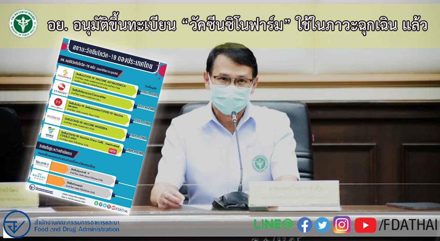 นายแพทย์ไพศาล ดั่นคุ้ม เลขาธิการคณะกรรมการอาหารและยา เปิดเผยว่า วันนี้ (28 พฤษภาคม 2564) สำนักงานคณะกรรมการอาหารและยา (อย.) ได้อนุมัติขึ้นทะเบียนวัคซีนของซิโนฟาร์ม นำเข้าโดยบริษัท ไบโอจีนีเทค จำกัด เป็นวัคซีนโควิด-19 รายการที่ 5 ของไทยเป็นที่เรียบร้อยแล้ว โดยเป็นการขึ้นทะเบียนแบบใช้ในภาวะฉุกเฉิน ซึ่งวัคซีนซิโนฟาร์มผลิตขึ้นโดยสถาบันชีววัตถุแห่งกรุงปักกิ่ง (Beijing Institute of Biological Product Co.LTD) เป็นวัคซีนที่ใช้เทคโนโลยีการผลิต “ชนิดเชื้อตาย” โดยการฉีดจะกำหนดให้ใช้ 2 เข็มในระยะห่างกัน 28 วัน โดยวัคซีนนี้ได้รับการรับรองให้นำมาใช้ในภาวะฉุกเฉินโดยองค์การอนามัยโลก (WHO EUL) แล้ว