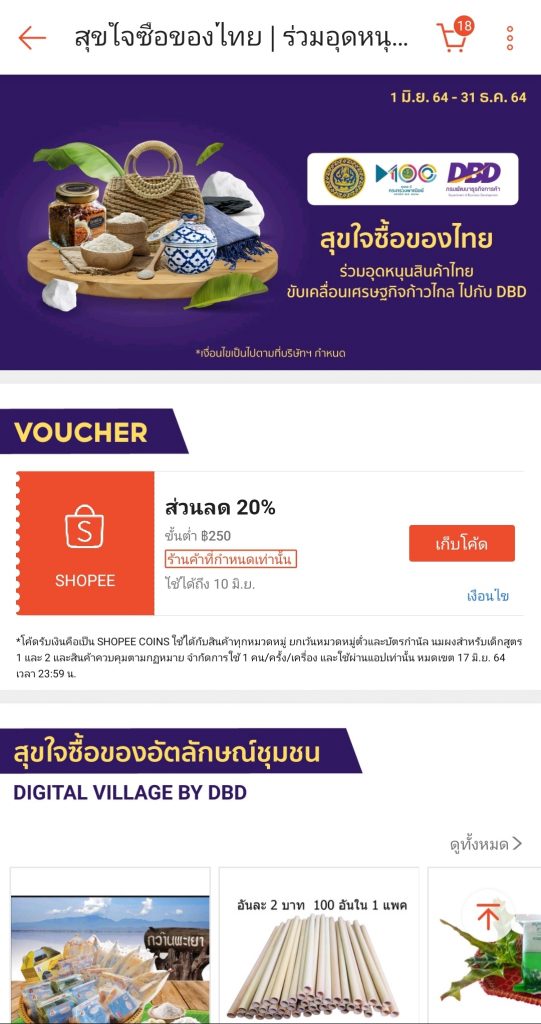 นนทบุรี 1 มิ.ย. – กรมพัฒนาธุรกิจการค้า ร่วมมือ Shopee ช่วยเหลือเกษตรกรและผู้ประกอบการสินค้าชุมชนขายสินค้าง่ายๆ บน Shopee พร้อมมอบส่วนลดพิเศษ ร้อยละ 20 ผ่านแคมเปญ “สุขใจซื้อของไทย” เพียงกรอก Code “DBD20” ระหว่างวันที่ 1-10 มิ.ย.64 ที่ www.shopee.co.th/dbdonline และแอปพลิเคชัน Shopee