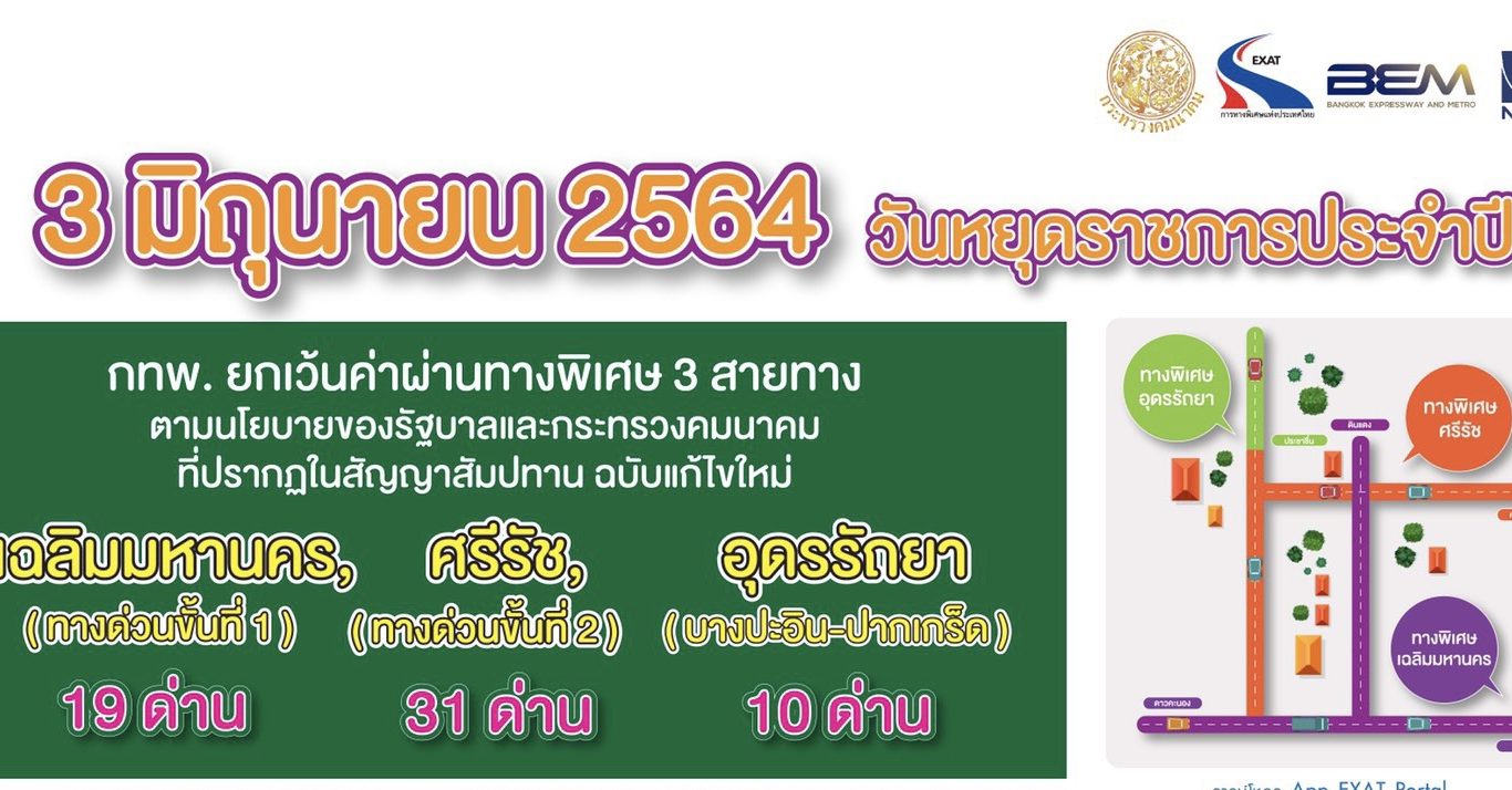 ผู้สื่อข่าวรายงานว่า การทางพิเศษแห่งประเทศไทย (กทพ.) ได้ออกประกาศยกเว้นค่าผ่านทางพิเศษของทางพิเศษ รวม 3 สายทาง ประกอบด้วย ทางพิเศษเฉลิมมหานคร (ทางด่วนขั้นที่ 1) จำนวน 19 ด่าน ทางพิเศษศรีรัช (ทางด่วนขั้นที่ 2) จำนวน 31 ด่าน และทางพิเศษอุดรรัถยา (บางปะอิน-ปากเกร็ด) จำนวน 10 ด่าน ในวันพฤหัสบดีที่ 3 มิถุนายน 2564 (วันเฉลิมพระชนมพรรษาสมเด็จพระนางเจ้าสุทิดา พัชรสุธาพิมลลักษณ พระบรมราชินี) ตั้งแต่เวลา 00.01 น. ถึง 24.00 น. จำนวน 1 วัน ซึ่งเป็นวันหยุดราชการประจำปีตามประกาศสำนักนายกรัฐมนตรี โดยเป็นไปตามนโยบายของรัฐบาลและกระทรวงคมนาคมที่ปรากฏในสัญญาสัมปทาน ฉบับแก้ไขใหม่ระหว่าง กทพ. บริษัท ทางด่วนและรถไฟฟ้ากรุงเทพ จำกัด (มหาชน) (BEM) และบริษัท ทางด่วนกรุงเทพเหนือ จำกัด (NECL) เพื่อช่วยลดภาระค่าใช้จ่ายให้แก่ประชาชน . -สำนักข่าวไทย