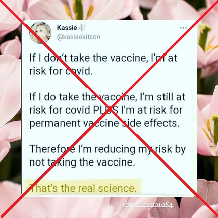 เป็นข้อความที่ถูกแชร์ทาง Instagram ก่อนจะถูกตั้งสถานะให้เป็นข่าวปลอม โดยเนื้อหาเป็นการชี้นำว่า “ถ้าฉันไม่ฉีดวัคซีน ฉันจะเสี่ยงติดโควิด ถ้าฉันฉีดวัคซีน ฉันก็ยังคงเสี่ยงติดโควิดแถมเสี่ยงกับอาการข้างเคียงระยะยาวจากวัคซีน ดังนั้นฉันจึงลดความเสี่ยงด้วยการไม่ฉีดวัคซีน”