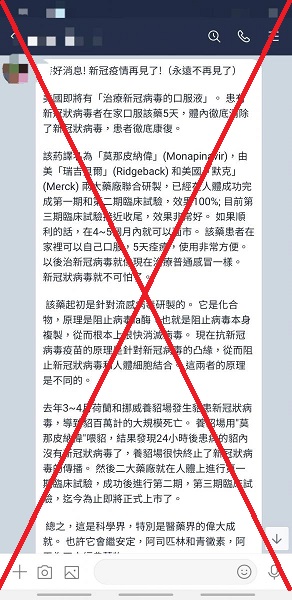 หนึ่งในข้อความอวดอ้างสรรพคุณของ Molnupiravir คือข้อความจาก Facebook ซึ่งส่งต่อกันในไต้หวันช่วงต้นเดือนเมษายน โดยข้อความระบุว่าบริษัทผู้ผลิตยาจากอเมริกา ได้ผลิตยาต้านไวรัสโควิด 19 ชนิดน้ำในชื่อ Molnupiravir ผู้ป่วยสามารถกินยาอยู่กับบ้านและเชื้อจะหมดไปจากร่างกายภายใน 5 วัน ตัวยาผ่านการทดลองทางคลินิกระยะที่ 1 และ 2 เรียบร้อยแล้ว ซึ่งการทดลองในมนุษย์ประสบผลสำเร็จ 100% การทดลองทางคลินิกระยะที่ 3 ใกล้จะเสร็จสิ้นและได้ผลที่น่าพอใจ คาดว่าจะวางจำหน่ายในท้องตลาดในอีก 4 ถึง 5 เดือนข้างหน้า และต่อไปโควิด 19 จะรักษาได้เองที่บ้านไม่ต่างจากไข้หวัดธรรมดา