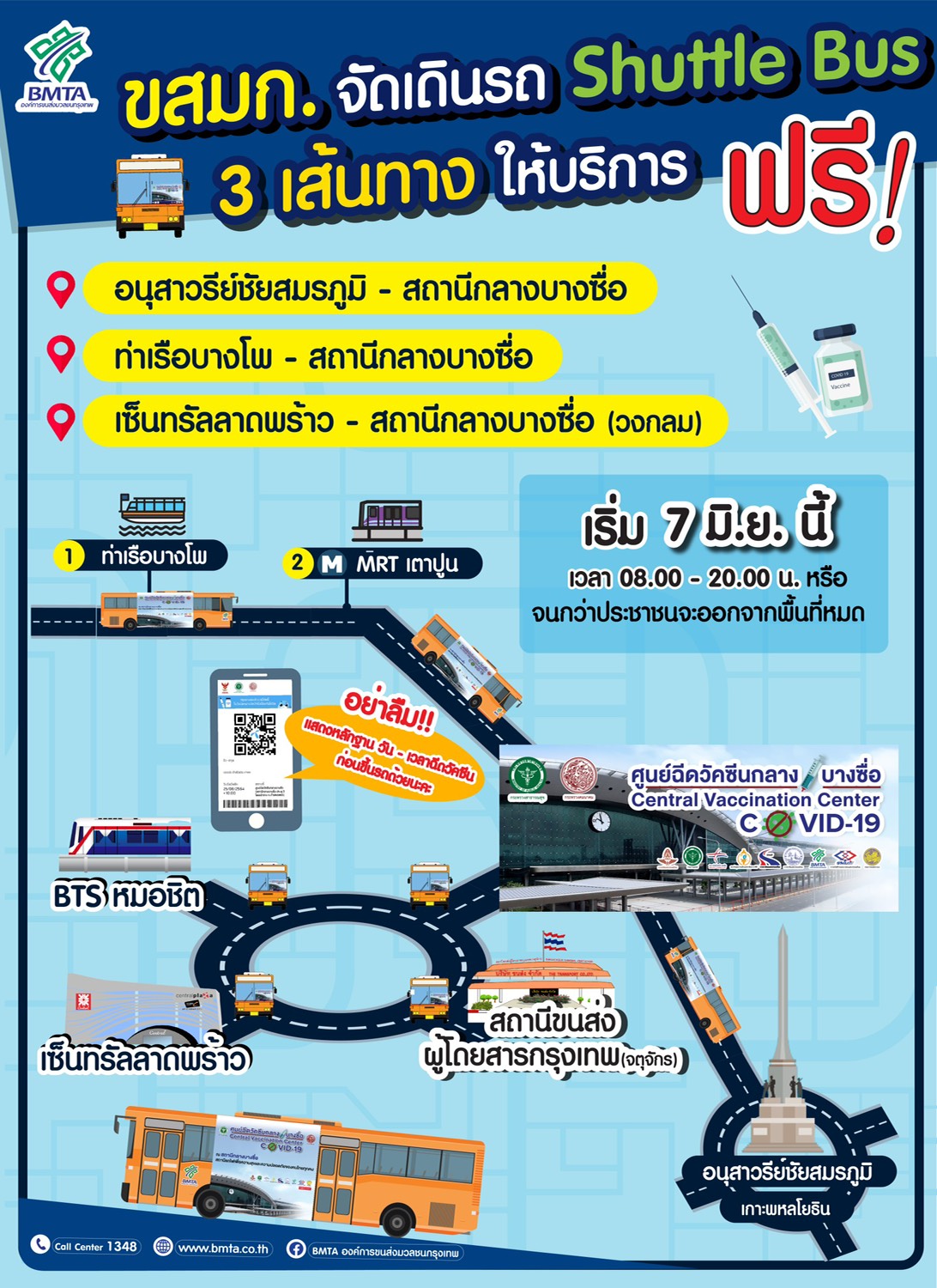 ทั้งนี้การดำเนินการเป็นไปตามนโยบายรัฐบาล โดยกระทรวงคมนาคม ที่ต้องการให้บริการฉีดวัคซีนป้องกันโรคติดเชื้อไวรัสโคโรนา 2019 (COVID – 19) แก่ประชาชนทั่วไป ที่ได้ลงทะเบียนจองคิวฉีดวัคซีนฯ ผ่านค่ายโทรศัพท์มือถือ AIS, Dtac, True Move และบริษัท โทรคมนาคมแห่งชาติ จำกัด (มหาชน) ณ ศูนย์ฉีดวัคซีนกลางบางซื่อ (CENTRAL VACCINATION CENTER : CVC) ตั้งแต่วันที่ 7 มิถุนายน 2564 เป็นต้นไป ขสมก. จึงเตรียมจัดเดินรถ Shuttle Bus ให้บริการฟรี จำนวน 3 เส้นทาง เพื่ออำนวยความสะดวกให้กับประชาชนที่เดินทางมาเข้ารับการฉีดวัคซีนฯ เริ่มให้บริการ ตั้งแต่วันที่ 7 มิถุนายน 2564 เป็นต้นไป ระหว่างเวลา 08.00 – 20.00 น. หรือจนกว่าประชาชนจะออกจากพื้นที่หมด