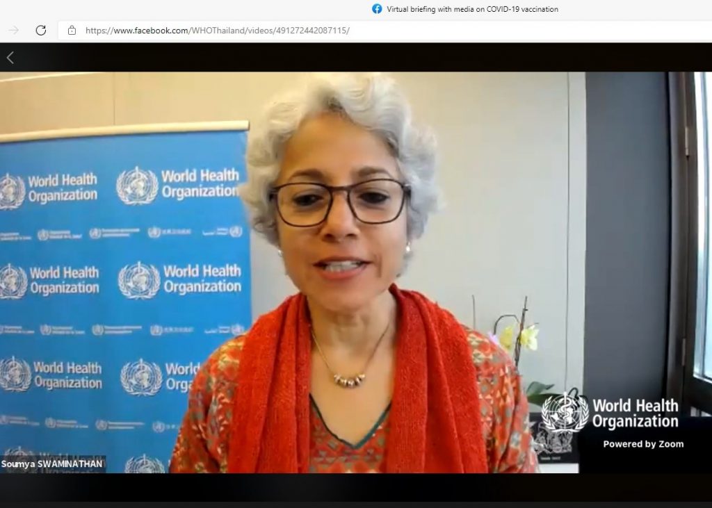 ดร.ซุมยา สวามินาธาน หัวหน้านักวิทยาศาสตร์ขององค์การอนามัยโลก กล่าวว่า วัคซีนโควิด 19 แต่ละตัว ไม่สามารถนำตัวเลขประสิทธิภาพมาเปรียบเทียบได้ เนื่องจากระเบียบวิธีการวิจัยต่างกัน สถานการณ์การระบาดและสายพันธุ์ที่ระบาดในแต่ละประเทศต่างกัน สิ่งสำคัญคือต้องดูเรื่องการป้องกันโรครุนแรงและเสียชีวิต ซึ่งวัคซีนแอสตร้าเซนเนก้าและซิโนแวคป้องกันอาการรุนแรงและเสียชีวิตได้ การฉีดวัคซีน 2 เข็มควรเป็นวัคซีนตัวเดียวกัน โดยขณะนี้กำลังศึกษาประสิทธิผลของการฉีดวัคซีนครบ 2 เข็มว่าป้องกันยาวนานแค่ไหน ขณะนี้มีข้อมูลแค่ช่วง 6 เดือน เนื่องจากยังต้องใช้เวลาในการศึกษา สำหรับคนที่ติดโควิดมาแล้วก็ยังต้องฉีดวัคซีนเพื่อกระตุ้นภูมิคุ้มกัน แต่หากวัคซีนในประเทศไม่เพียงพอ คนกลุ่มนี้รอฉีดได้ประมาณ 6 เดือน