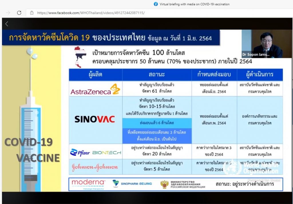 วันนี้ (2 มิถุนายน 2564) กระทรวงสาธารณสุข ร่วมกับองค์การอนามัยโลกประจำประเทศไทยสถาบันวัคซีนแห่งชาติ จัดบรรยายสรุปเรื่องการกระจายวัคซีนในประเทศไทย ผ่านทางออนไลน์ด้วยระบบ Zoom โดยนายแพทย์โสภณ เอี่ยมศิริถาวร รองอธิบดีกรมควบคุมโรค กล่าวว่า ขณะนี้ได้ทยอยส่งวัคซีนโควิด 19 ทั้งวัคซีนของแอสตร้าเซนเนก้าและซิโนแวค ให้ทุกโรงพยาบาลแล้ว เพื่อคิกออฟฉีดวัคซีนโควิด 19 ในวันที่ 7 มิถุนายน 2564 พร้อมกันทุกพื้นที่ โดยคนที่ลงทะเบียนผ่านหมอพร้อมตั้งแต่เดือนพฤษภาคมที่ผ่านมา ได้รับการฉีดวัคซีนตามการนัดหมายของสถานพยาบาล ทั้งนี้ กระทรวงสาธารณสุขจะทยอยส่งวัคซีนให้โรงพยาบาลเป็นงวดๆ ในแต่ละสัปดาห์ ตามการจัดส่งของผู้ผลิต โดยสัปดาห์นี้จะกระจายวัคซีนทั้งของแอสตร้าเซนเนก้าและซิโนแวครวมประมาณ 2 ล้านโดส คาดว่าทั้งเดือนมิถุนายนจะมีการส่งวัคซีนประมาณ 5-6 ล้านโดส จัดส่งให้ทุกจังหวัด ส่วนพื้นที่ระบาดจะได้รับสัดส่วนสูงกว่าพื้นที่ระบาดน้อย เช่น กรุงเทพมหานครได้รับประมาณ 1 ล้านโดส จะส่งให้ 5 แสนโดสก่อนใน 2 สัปดาห์แรกยืนยันว่าจะได้รับวัคซีนครบทุกจังหวัดภายใน 4-6 เดือน สำหรับการฉีดวัคซีนยึดตามหลักข้อบ่งชี้ทางการแพทย์และสาธารณสุข