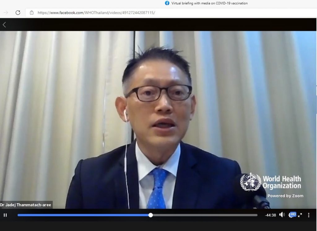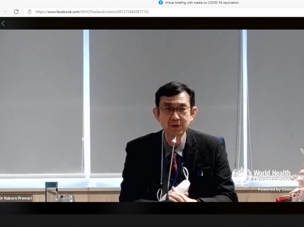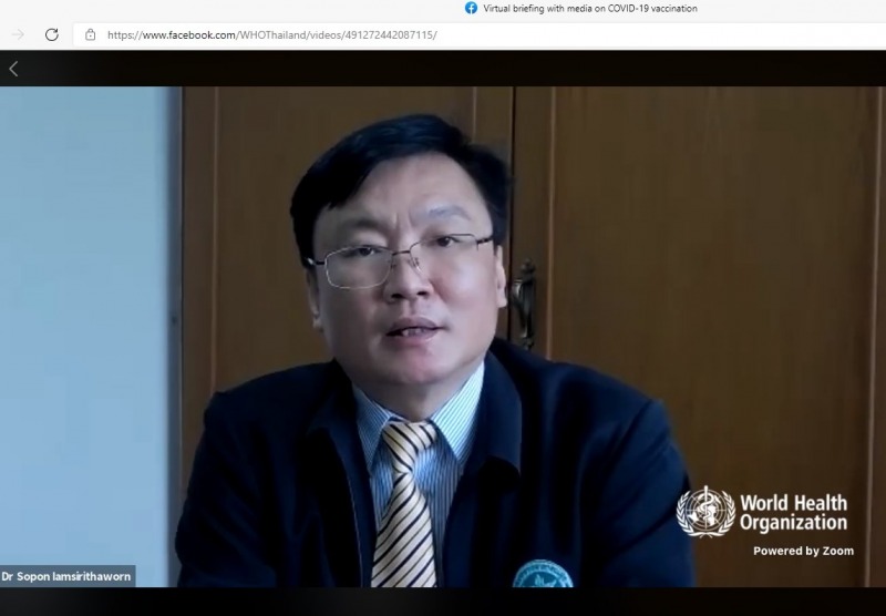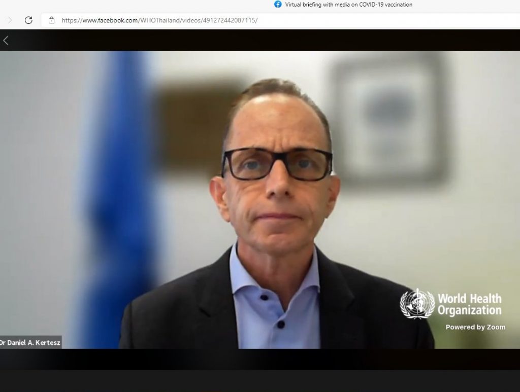 ด้านนายแพทย์แดเนียล เคอร์เทสซ์ ผู้แทนองค์การอนามัยโลกประจำประเทศไทย กล่าวว่า การฉีดวัคซีนจำนวนมากตั้งแต่วันที่ 7 มิถุนายนของประเทศไทยเป็นเรื่องที่ดีมาก ทั้งนี้ วัคซีนแอสตร้าเซนเนก้าและซิโนแวคมีประสิทธิภาพและความปลอดภัยสูง ทั่วโลกมีการใช้แล้วช่วยป้องกันการเสียชีวิตได้ จึงขอให้ทุกคนไปรับการฉีดวัคซีน โดยเฉพาะผู้สูงอายุและ 7 โรคเรื้อรังที่เป็นกลุ่มเสี่ยงอาการรุนแรงและเสียชีวิตสูง นอกจากนี้ สื่อมวลชนมีความสำคัญช่วยในการช่วยควบคุมโรคและส่งเสริมให้ประชาชนเข้ารับวัคซีน ด้วยการให้ข้อมูลที่ถูกต้องแก่ประชาชนให้เข้าใจว่าเกิดอะไรขึ้น ประเมินความเสี่ยงตัวเองได้ว่าอยู่กลุ่มไหน ควรทำอะไรอย่างไร เพราะไม่ใช่แค่วัคซีนที่ป้องกันการชีวิตได้ การให้ข้อมูลที่ถูกต้องจะป้องกันการเสียชีวิตได้ด้วย และย้ำว่าแม้ฉีดวัคซีนแล้วการ์ดอย่าตกยังต้องใส่หน้ากาก ล้างมือ เว้นระยะห่างเหมือนเดิม