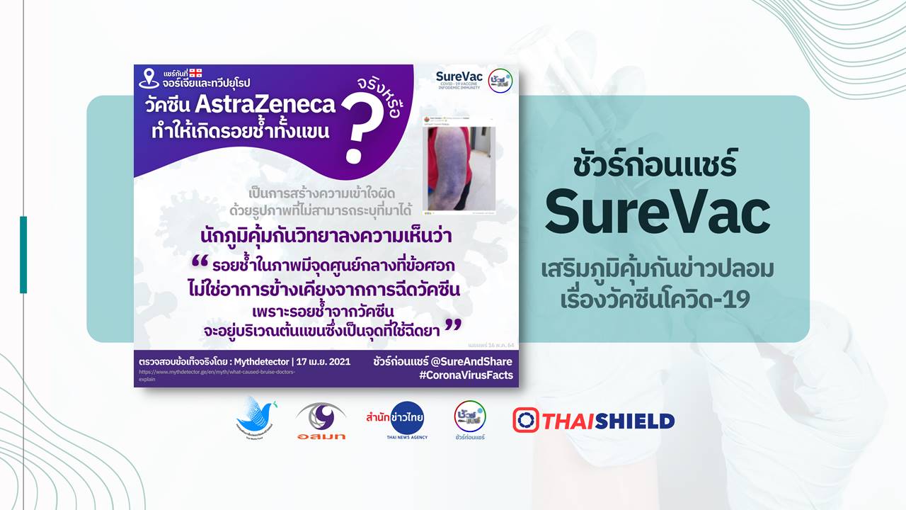 ลาลี เพิร์ทชาลิสวิลลี นักภูมิคุ้มกันวิทยาจากโรงพยาบาล Evex Hospitals อธิบายว่าการฉีดวัคซีนอาจก่อให้เกิดรอยช้ำบริเวณที่ฉีดยา หากเกิดอาการข้างเคียง รอยช้ำจะขยายตัวจากต้นแขนซึ่งเป็นจุดที่ฉีดยา แต่รอยช้ำที่ดูเหมือนมีการตกเลือดในรูปภาพที่เห็น มีจุดศูนย์กลางรอยช้ำอยู่ที่ข้อศอก สันนิฐานเบื้องต้นได้ว่ารอยช้ำไม่ได้มาจากการฉีดวัคซีน