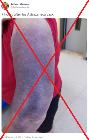มีการเผยแพร่ข้อมูลและรูปภาพจากผู้ใช้ Facebook ที่ชื่อว่า Katya Petrova โดยอ้างว่า Mayya Zankova ซึ่งอยู่ในรูปภาพเพิ่งจะผ่านการฉีดวัคซีนโควิด 19 ของ AstraZeneca มาได้ 7 ชั่วโมง และเกิดรอยช้ำรุนแรงไปทั่วทั้งแขน จนภาพและข้อมูลดังกล่าวถูกนำไปแชร์ต่อกันกว่า 7 หมื่นครั้ง