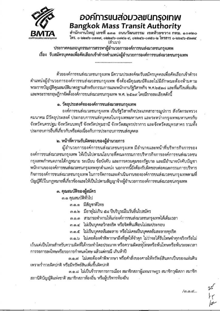 กรุงเทพฯ 8 มิ.ย.-ขสมก. ประกาศรับสมัครบุคคล เพื่อคัดเลือกเข้าดำรงตำเเหน่ง ผู้อำนวยการองค์การขนส่งมวลชนกรุงเทพคนใหม่ สนใจยื่นใบสมัครได้ ตั้งเเต่วันที่ 10 – 30 มิถุนายน 2564 นี้