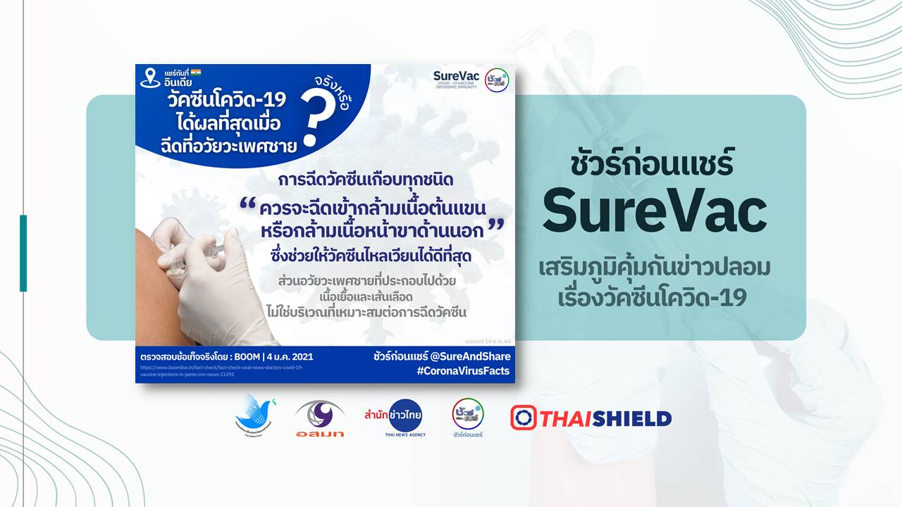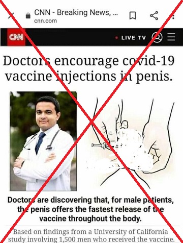เป็นรูปภาพและข้อความเท็จที่เผยแพร่ผ่านทาง Twitter ในประเทศอินเดีย โดยอ้างว่าแพทย์จากมหาวิทยาลัย University of California ค้นพบว่าการฉีดวัคซีนโควิด 19 ที่บริเวณอวัยวะเพศชาย จะทำให้ตัวยาไหลเวียนได้ดีที่สุด ซึ่งการอ้างว่าเป็นรายงานจากสถานีข่าว CNN ทำให้ผู้ใช้อินเทอร์เน็ทไม่น้อยหลงเชื่อแล้วนำข้อมูลไปแชร์ต่อ