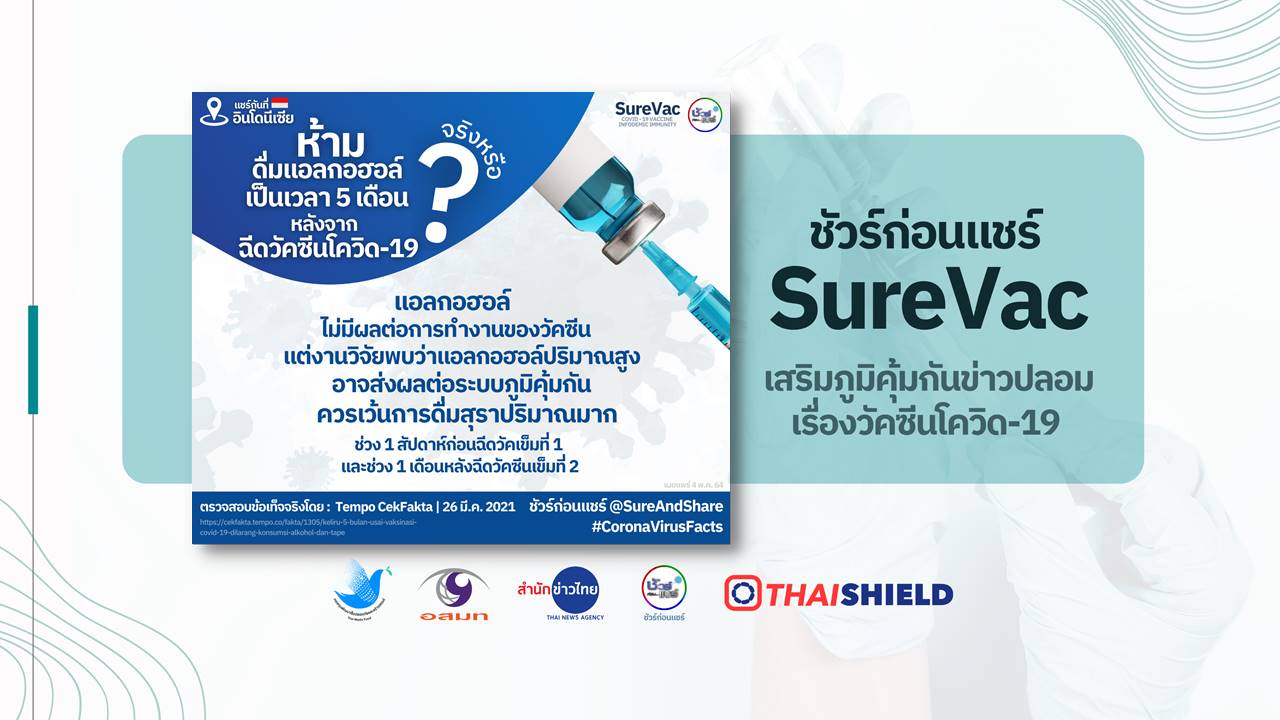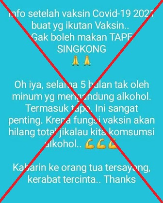 มีการแชร์ข้อความทาง Facebook ในประเทศอินโดนีเซียว่า ผู้ที่ฉีดวัคซีนโควิด 19 แล้ว ห้ามดื่มสุราหรือรับประทานข้าวหมัก (tapai) เป็นเวลา 5 เดือน เพราะจะทำให้วัคซีนหมดประสิทธิภาพในการป้องกันโรคทันที