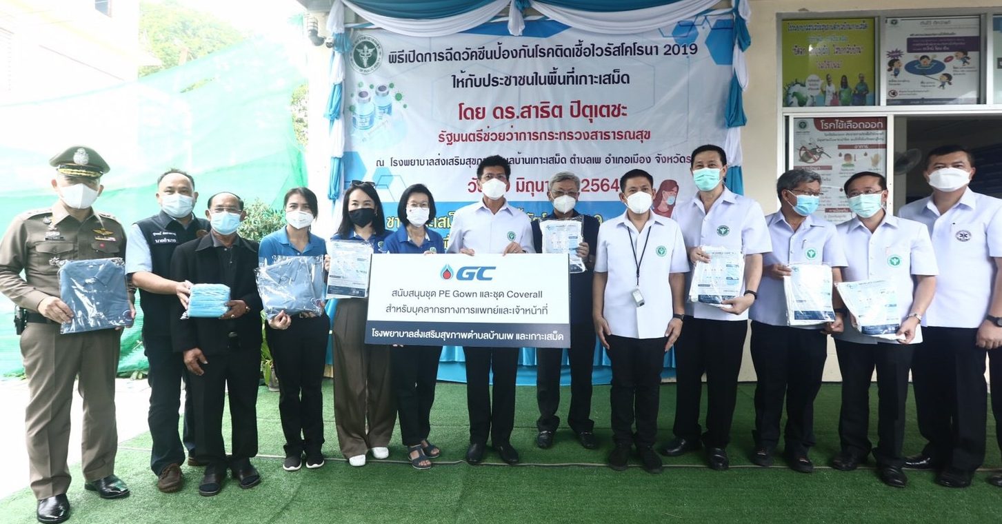 บมจ.พีทีทีโกลบอลเคมิคอล(GC)สนับสนุนชุดคลุมปฏิบัติการ Coverall และชุดกาวน์กันน้ำ (PE Gown) เพื่อป้องกันบุคลากรทางการแพทย์ในการลงพื้นที่เกาะเสม็ด จังหวัดระยอง ให้เป็นพื้นที่แรกของประเทศไทยที่ฉีดวัคซีนป้องกันโควิด 19 ทั้งเกาะแบบ 100% และยังเป็นที่แรกที่ใช้สถานที่ฉีดเป็นโรงพยาบาลส่งเสริมสุขภาพตำบล ด้วยความร่วมมือของโรงพยาบาลระยอง และทุกภาคส่วน โดยมีนายสาธิต ปิตุเตชะ รัฐมนตรีช่วยว่าการกระทรวงสาธารณสุข และนายชาญนะ เอี่ยมแสง ผู้ว่าราชการจังหวัดระยองเป็นผู้รับมอบ และเป็นประธานในพิธีเปิดการฉีดวัคซีนป้องกันโรคโควิด 19 ให้กับประชาชนในพื้นที่เกาะเสม็ด จำนวน 1,800 ราย