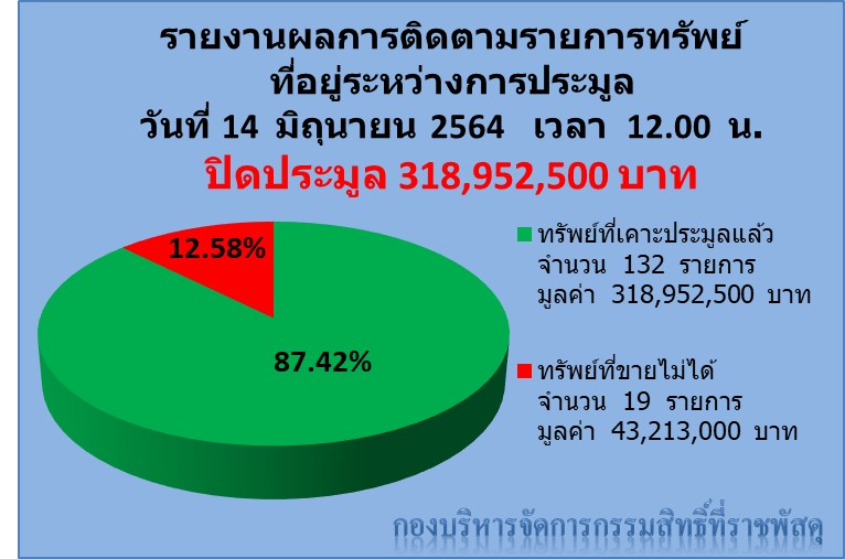 นายยุทธนา หยิมการุณ อธิบดีกรมธนารักษ์ เปิดเผยว่า จากการเปิดประมูลขายที่ราชพัสดุที่ได้มาโดยคำพิพากษาของศาลให้ตกเป็นของแผ่นดิน ซึ่งเป็นทรัพย์สินที่ยึดมาจากคดีความผิดในการฟอกเงินตามกฎหมาย ปปง. และ ป.ป.ช.ผ่านระบบอิเล็กทรอนิกส์ Treasury e-Auction ซึ่งเป็นระบบประมูลทรัพย์ออนไลน์ ผ่านเว็บไซต์ https://auction.treasury.go.th ที่ได้ดำเนินการร่วมกับธนาคารกรุงไทย จำกัด (มหาชน) พัฒนาระบบประมูลขายทรัพย์สินดังกล่าว โดยเปิดประมูลตั้งแต่วันที่ 7 มิถุนายน และปิดการประมูลเมื่อเวลา 12.00 น. ของวันที่ 14 มิถุนายน 2564ที่ผ่านมา โดยสร้างรายได้จากประมูลทรัพย์สินฯ เกินเป้า ซึ่งตั้งไว้ที่ 250-270 ล้านบาท แต่เมื่อจบการประมูลยอดพุ่งสูงถึงกว่า 300 ล้านบาท