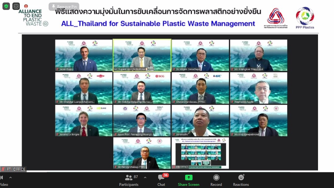 นายสุพันธุ์ มงคลสุธี ประธานสภาอุตสาหกรรมแห่งประเทศไทย (ส.อ.ท.) , ดร.วิจารย์ สิมาฉายา ประธานโครงการความร่วมมือภาครัฐ ภาคธุรกิจ ภาคประชาสังคม เพื่อจัดการพลาสติก และขยะอย่างยั่งยืน (PPP Plastics) และ Mr. Jacob Duer ประธานบริหาร Alliance to End Plastic Waste ร่วมแถลงข่าว “ประกาศความร่วมมือโครงการ ALL_THAILAND …เพื่อจัดการพลาสติกอย่างยั่งยืน”