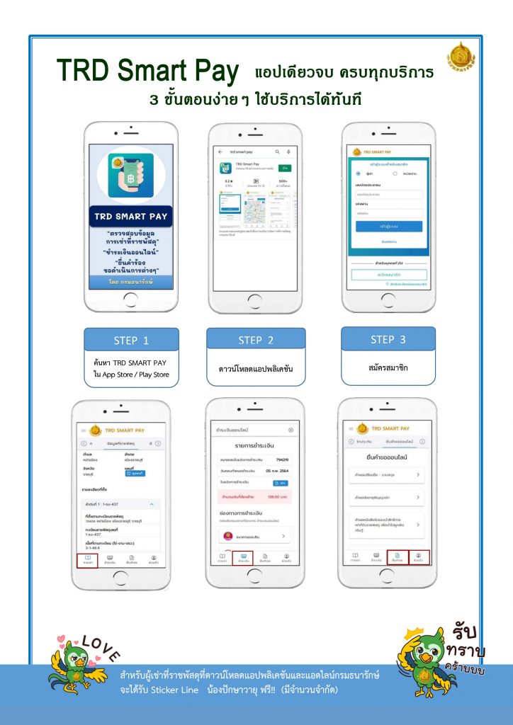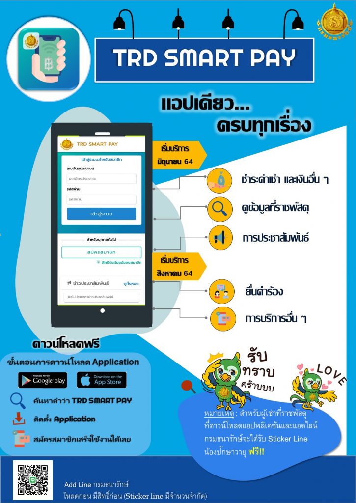 ทั้งนี้ แอปพลิเคชัน TRD SMART PAY เป็นแพลตฟอร์มที่พัฒนาขึ้นทั้งในระบบปฏิบัติการ iOS (App Store) และ Android (Play Store) เพื่อให้บริการแก่ผู้เช่าที่ราชพัสดุผ่านระบบออนไลน์ ซึ่งจะช่วยอำนวยความสะดวกให้แก่ผู้เช่าที่ราชพัสดุทั่วประเทศ ประมาณ 182,000 ราย ให้สามารถเข้าถึงข้อมูลที่ราชพัสดุได้อย่างรวดเร็ว ด้วยรูปแบบการใช้งานที่ครอบคลุมบริการต่างๆ ได้แก่ การตรวจสอบข้อมูล การเช่าที่ราชพัสดุ อัตราค่าเช่า สัญญาเช่า แปลงที่ราชพัสดุที่เช่า การตรวจสอบรายการที่ต้องชำระเงิน ค่าเช่า ค่าธรรมเนียม หลักประกันการเช่า และเงินอื่นๆ การชำระเงินออนไลน์ผ่านบัตรเครดิต/เดบิต (Payment Gateway) และผ่านสถาบันการเงินชั้นนำ (Page to Page) รวม 7 แห่ง ประกอบด้วย บมจ. ธนาคารกรุงไทย ธนาคารออมสิน บมจ. ธนาคารกรุงศรีอยุธยา บมจ. ธนาคารไทยพาณิชย์ บมจ.ธนาคารทหารไทย บมจ. ธนาคารกสิกรไทย และ บมจ. ธนาคารกรุงเทพ โดยไม่มีค่าใช้จ่ายในการ ใช้บริการแต่อย่างใด การยื่นคำร้องขอดำเนินการต่างๆ เช่น ขอโอนสิทธิ สืบสิทธิ รังวัดแนวเขตการเช่า เป็นต้น รวมไปถึงการติดตามสถานะ และผลการดำเนินงานของเจ้าหน้าที่ พร้อมมีระบบการแจ้งเตือนอัตโนมัติเพื่อให้ผู้เช่าที่ราชพัสดุสามารถเข้าถึงข้อมูลข่าวสารประชาสัมพันธ์จากกรมธนารักษ์ได้ตลอดเวลา ทั้งนี้ แอปพลิเคชัน TRD SMART PAY ได้คำนึงถึงความปลอดภัยสูงสุดของผู้ใช้งานเป็นหลัก โดยผู้เช่าที่ราชพัสดุสามารถยืนยันตัวตนผ่านโทรศัพท์มือถือที่ลงทะเบียนไว้ และสามารถแก้ไขข้อมูลส่วนบุคคลได้ด้วยตนเอง