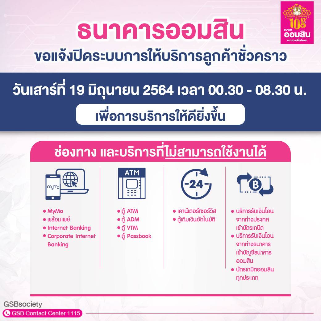 รายงานข่าวจากธนาคารออมสิน แจ้งว่า ธนาคารฯ จะปิดปรับปรุงระบบคอมพิวเตอร์แม่ข่ายข้อมูลการให้บริการลูกค้า เป็นการชั่วคราว ในวันเสาร์ที่ 19 มิถุนายน 2564 ตั้งแต่เวลา 00.30 – 08.30 น. เพื่อพัฒนาและเพิ่มประสิทธิภาพระบบคอมพิวเตอร์แม่ข่ายข้อมูลการให้บริการลูกค้า ให้สามารถรองรับการขยายตัวของปริมาณธุรกรรมทางการเงินที่จะเพิ่มขึ้นในอนาคตให้ดียิ่งขึ้น โดยการปิดระบบในช่วงเวลาดังกล่าวเพื่อหลีกเลี่ยงผลกระทบต่อผู้ใช้บริการให้มากที่สุด ซึ่งจะทำให้ไม่สามารถทำธุรกรรมทางการเงิน และใช้บริการ ฝาก ถอน โอน จ่ายได้ ทั้งในและต่างประเทศทุกช่องทาง อาทิ MyMo, พร้อมเพย์, บัตรเดบิต, บัตรเอทีเอ็ม, Internet Banking, Corporate Internet Banking, เครื่อง ATM, ADM, VTM, Passbook Update รวมถึงตู้เติมเงิน และเคาน์เตอร์เซอร์วิส