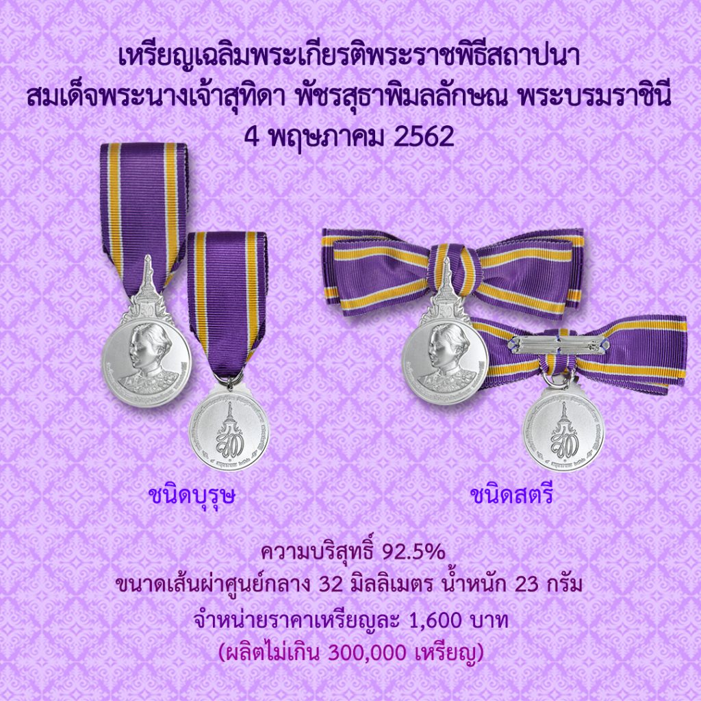 รายงานข่าวจากกกระทรวงการคลังแจ้งว่า กรมธนารักษ์จัดทำเหรียญกษาปณ์ที่ระลึกในโอกาสพระราชพิธีราชาภิเษกสมรส 1 พฤษภาคม 2562 และเหรียญเฉลิมพระเกียรติพระราชพิธีสถาปนาสมเด็จพระนางเจ้าสุทิดา พัชรสุธาพิมลลักษณ พระบรมราชินี 4 พฤษภาคม 2562 เพื่อเป็นการเฉลิมพระเกียรติและน้อมสำนึกในพระมหากรุณาธิคุณพระบาทสมเด็จพระเจ้าอยู่หัว และสมเด็จพระนางเจ้าฯ พระบรมราชินี ที่ทั้งสองพระองค์ทรงตั้งมั่นพระราชปณิธาน “สืบสาน รักษา ต่อยอด” แนวคิดในพระบาทสมเด็จพระบรมชนกาธิเบศร มหาภูมิพลอดุลยเดชมหาราช บรมนาถบพิตร และสมเด็จพระนางเจ้าสิริกิติ์ พระบรมราชินีนาถ พระบรมราชชนนีพันปีหลวง เพื่อทรงแก้ไขและบรรเทาปัญหาความเดือดร้อนของประชาชนให้มีความร่มเย็นเป็นสุข ด้วยน้ำพระราชหฤทัย อันเต็มเปี่ยมไปด้วยพลังรักที่มีต่อพสกนิกรชาวไทย และเผยแพร่พระเกียรติคุณของทั้งสองพระองค์ให้แผ่ไพศาลไปทั้งภายในประเทศและนานาประเทศ