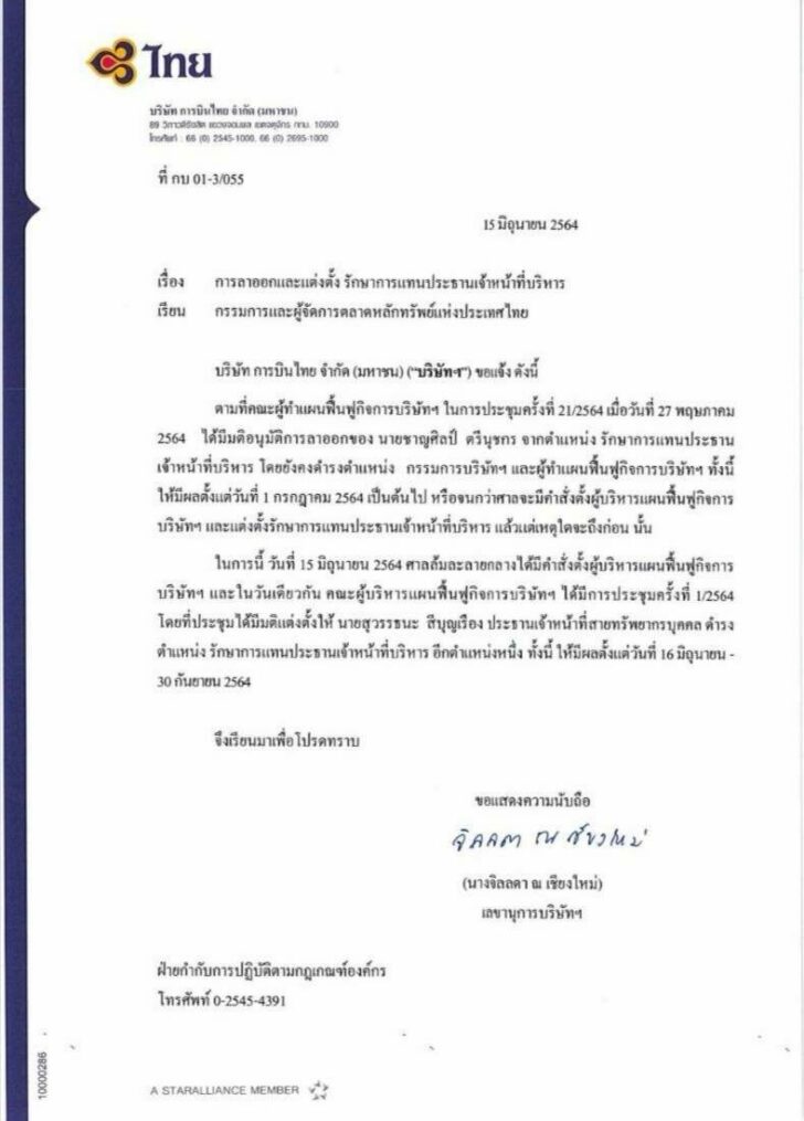 รายงานข่าวจากบริษัท การบินไทย จำกัด (มหาชน) หรือ THAI ระบุว่า วานนี้ (15 มิถุนายน 2564) ได้ทำหนังสือแจ้งตลาดหลักทรัพย์แห่งประเทศไทย (ตลท.) เรื่อง การลาออก และแต่งตั้งรักษาการแทนประธานเจ้าหน้าที่บริหาร โดยระบุอีกว่า ตามที่คณะผู้ทำแผนฟื้นฟูกิจการบริษัทฯ ในการประชุมครั้งที่ 21/2564 เมื่อวันที่ 27 พ.ค. 2564 ได้มีมติอนุมัติการลาออกของนายชาญศิลป์ ตรีนุชกร จากตำแหน่งรักษาการแทนประธานเจ้าหน้าที่บริหาร โดยยังคงดำรงตำแหน่ง กรรมการบริษัทฯ และผู้ทำแผนฟื้นฟูกิจการบริษัทฯ ทั้งนี้ ให้มีผลตั้งแต่วันที่ 1 ก.ค. 2564 เป็นต้นไป หรือจนกว่าศาลจะมีดำสั่งตั้งผู้บริหารแผนฟื้นฟูกิจการบริษัทฯ และแต่งตั้งรักษาการแทนประธานเจ้าหน้าที่บริหาร แล้วแต่เหตุใดจะถึงก่อนนั้น