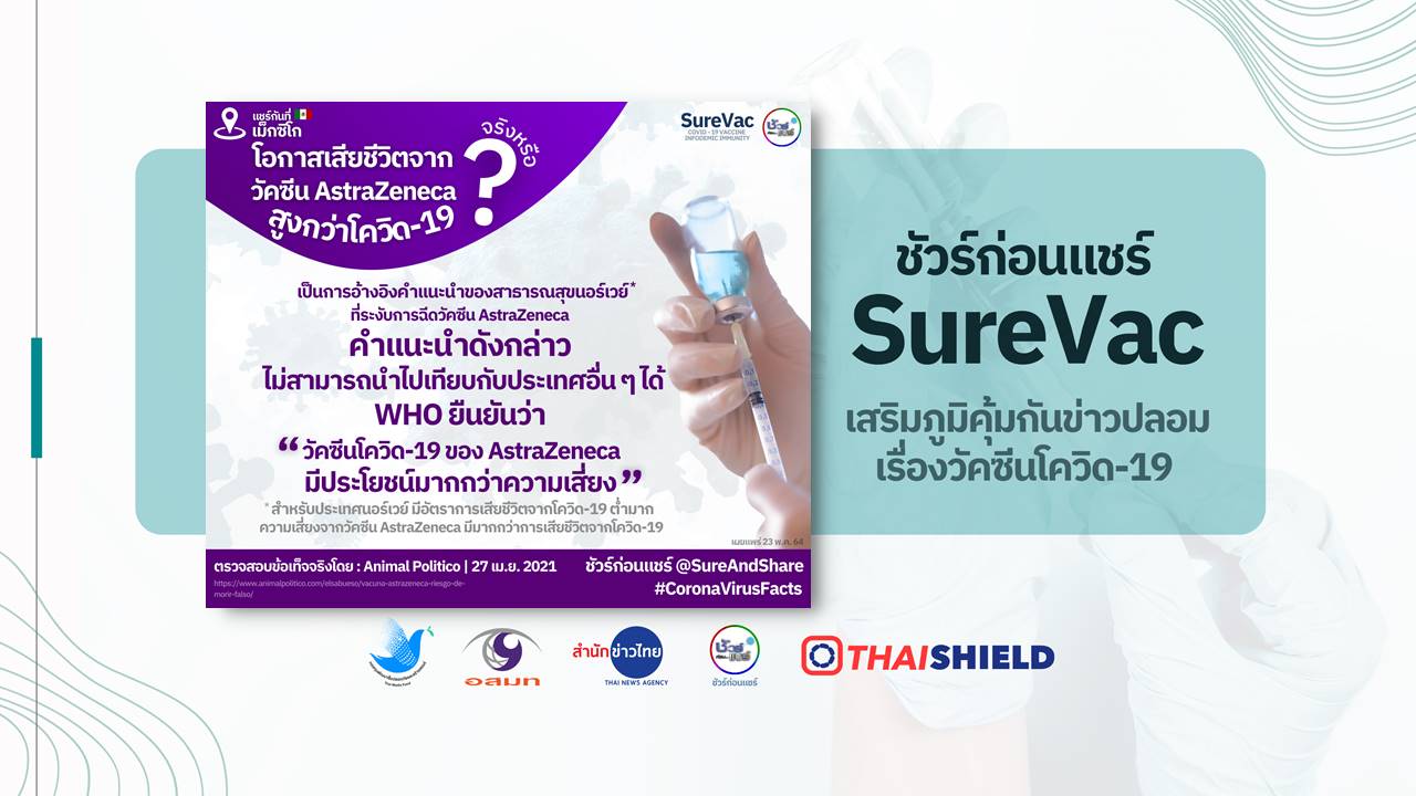 มีข้อความเผยแพร่ทาง Facebook ในประเทศเม็กซิโกที่ถูกแชร์หลายร้อยครั้ง โดยเนื้อหาโจมตีรัฐบาลเม็กซิโกที่สั่งซื้อวัคซีนโควิด 19 ของบริษัท AstraZeneca โดยอ้างว่าโอกาสการเสียชีวิตจากวัคซีน AstraZeneca มีมากกว่าการเสียชีวิตจากโควิด 19 โดยผู้โพสต์อ้างอิงตามคำแนะนำของหน่วยงานสาธารณสุขนอร์เวย์ ที่แนะนำให้ประเทศนอร์เวย์ระงับการฉีดวัคซีน AstraZeneca หลังพบการเกิดลิ่มเลือดอุดตันในกลุ่มผู้รับวัคซีนโควิด 19 ของ AstraZeneca