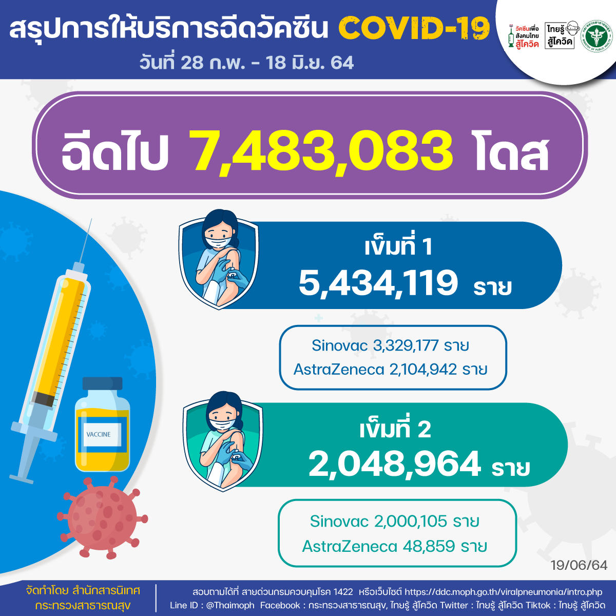 นพ.เกียรติภูมิ วงศ์รจิต ปลัดกระทรวงสาธารณสุข กล่าวว่า รัฐบาลมีนโยบายให้การฉีดวัคซีนโควิด-19 เป็นวาระแห่งชาติ เพื่อลดการป่วยรุนแรงและการเสียชีวิตจากโรคโควิด-19 เร่งสร้างภูมิคุ้มกันหมู่ เตรียมพร้อมฟื้นฟูเศรษฐกิจประเทศ และกระตุ้นการท่องเที่ยว ให้ประชาชนได้กลับมาดำเนินชีวิตตามปกติโดยเร็วที่สุด ตั้งเป้าหมายจัดหาวัคซีนสำหรับฉีดให้คนในประเทศกว่า 100 ล้านโดส ภายในปี 2564 โดยเริ่มฉีดวัคซีนโควิด-19 ให้บุคลากรทางการแพทย์และประชาชนเสี่ยงกลุ่มต่างๆ ตั้งแต่วันที่ 28 กุมภาพันธ์ 2564 และเริ่มฉีดอย่างเป็นทางการพร้อมกันทั่วประเทศ ในวันที่ 7 มิถุนายน 2564 ข้อมูลล่าสุดถึงวันที่ 18 มิถุนายน 2564 ฉีดวัคซีนไปแล้ว 7,483,083 โดส เป็นเข็มที่ 1 จำนวน 5,434,119 ราย และเข็มที่ 2 จำนวน 2,048,964 ราย