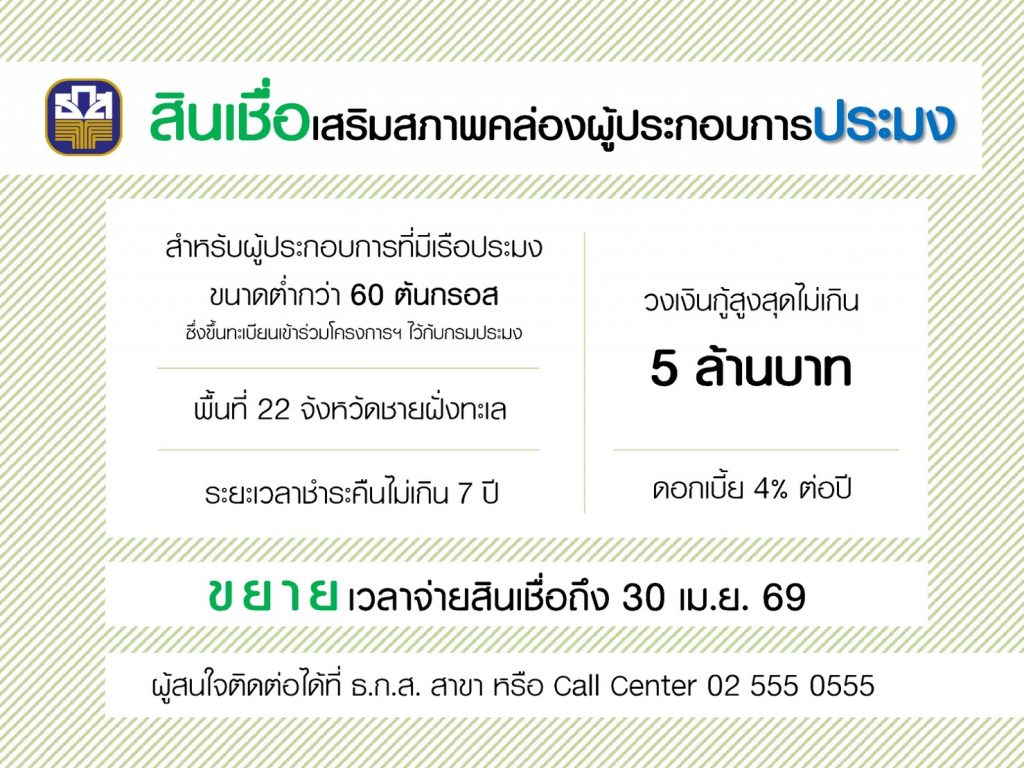 นายธนารัตน์ งามวลัยรัตน์ ผู้จัดการธนาคารเพื่อการเกษตรและสหกรณ์การเกษตร (ธ.ก.ส.) เปิดเผยว่า ตามที่ ธ.ก.ส. ได้ดำเนินโครงการสินเชื่อเพื่อเสริมสภาพคล่องผู้ประกอบการประมง โดยสนับสนุนสินเชื่อดอกเบี้ยต่ำให้แก่ผู้ประกอบการประมงพาณิชย์และประมงพื้นบ้าน ตามนโยบายของรัฐบาล ในพื้นที่ 22 จังหวัดติดชายฝั่งทะเล ได้แก่ จังหวัดตราด จันทบุรี ระยอง ชลบุรี ฉะเชิงเทรา สมุทรปราการ สมุทรสาคร สมุทรสงคราม เพชรบุรี ประจวบคีรีขันธ์ ชุมพร สุราษฎร์ธานี นครศรีธรรมราช สงขลา ปัตตานี นราธิวาส สตูล ตรัง ภูเก็ต พังงา กระบี่ และระนอง วงเงินรวม 5,300 ล้านบาท ตั้งแต่ปี 2563 นั้น เพื่อให้การดำเนินงานมีความต่อเนื่อง สามารถบรรเทาปัญหาด้านสภาพคล่อง และทำให้ผู้ประกอบการประมงมีเงินทุนในการประกอบอาชีพ ปรับปรุงเรือประมง ปรับเปลี่ยนเครื่องมืออุปกรณ์การประมงให้ถูกต้อง ป้องกันการทำประมงผิดกฎหมาย (Illegal Unreported and Unregulated Fishing : IUU) พัฒนาและยกระดับการทำประมงให้เทียบเท่ามาตรฐานสากล รักษาทรัพยากรทางธรรมชาติทางทะเลให้อยู่อย่างยั่งยืน ธ.ก.ส. ได้ขยายเวลา การจ่ายสินเชื่อไปเป็นวันที่ 30 เมษายน 2569