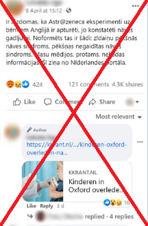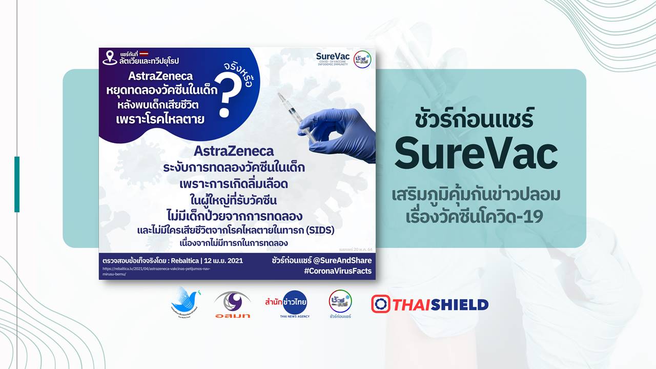 มีข้อความทาง Facebook ที่อ้างว่าบริษัท AstraZeneca ได้ระงับการทดลองวัคซีนโควิด 19 ในเด็ก หลังพบเด็กเสียชีวิตจากโรคไหลตายในทารก (SIDS) จนข้อความถูกแชร์ทาง Facebook ไปแล้วกว่า 4 พันครั้ง