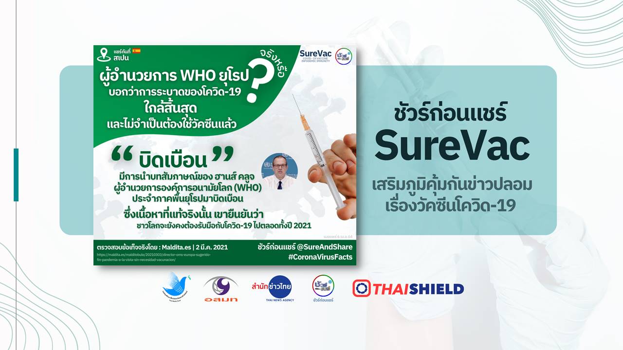 มีการนำบทสัมภาษณ์ของ ฮานส์ คลูจ ผู้อำนวยการองค์การอนามัยโลก (WHO) ประจำภาคพื้นยุโรป มาบิดเบือนแล้วเผยแพร่บนโลกออนไลน์ โดยข้อความระบุว่าการระบาดของโควิด 19 จะสิ้นสุดลงในเวลาไม่กี่เดือน และการฉีดวัคซีนก็จะไม่มีความจำเป็นอีกต่อไป