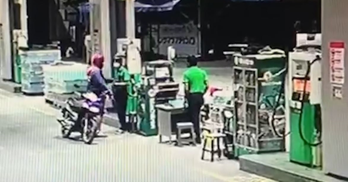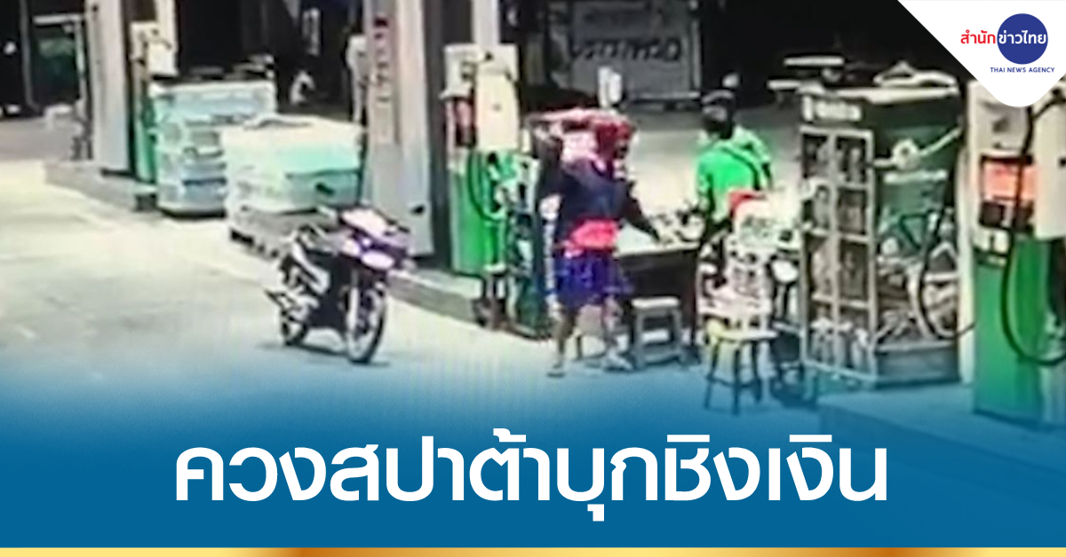 วงจรปิดอีกมุมจับภาพขณะคนร้ายลงจากรถจักรยานยนต์มาพูดคุยกับพนักงานเติมน้ำมัน จากนั้นได้ใช้อาวุธมีดสปาต้าข่มขู่เอาเงินที่อยู่ในกระเป๋าคาดเอวของพนักงานเติมน้ำมัน ได้เงินไปกว่า 7,000 บาท ก่อนหลบหนีไปได้