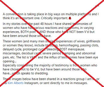 ข้อกล่าวอ้างดังกล่าวไม่เป็นความจริง ไม่มีหลักฐานว่าวัคซีนมีผลต่อประจำเดือนหรือความเป็นหมันในสตรี ยิ่งไปกว่านั้น อาการข้างเคียงของผู้ฉีดวัคซีนไม่สามารถส่งผ่านไปยังคนที่อยู่ใกล้ชิดได้เช่นกัน