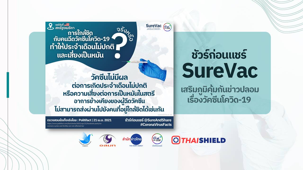 เป็นข้อมูลเท็จที่แชร์ผ่านทาง Facebook และ Instagram เมื่อวันที่ 15 เมษายนก่อนจะถูก Facebook ตั้งสถานะให้เป็นข่าวปลอม โดยเนื้อหาอ้างว่าหญิงสาวที่อยู่ในวัยเจริญพันธุ์หลายคนที่รับการฉีดวัคซีนโควิด 19 หรืออยู่ใกล้ชิดกับคนฉีดวัคซีน ต่างประสบปัญหาประจำเดือนมาไม่ปกติ, ประจำเดือนมาช้า, ปัญหาระดูยาว, เกิดอาการตกเลือด, เกิดลิ่มเลือดในประจำเดือน, เกิดภาวะเลือดออกหลังวัยหมดระดู, แท้งบุตร, ตั้งครรภ์นอกมดลูก, และอาการปวดประจำเดือนรุนแรง