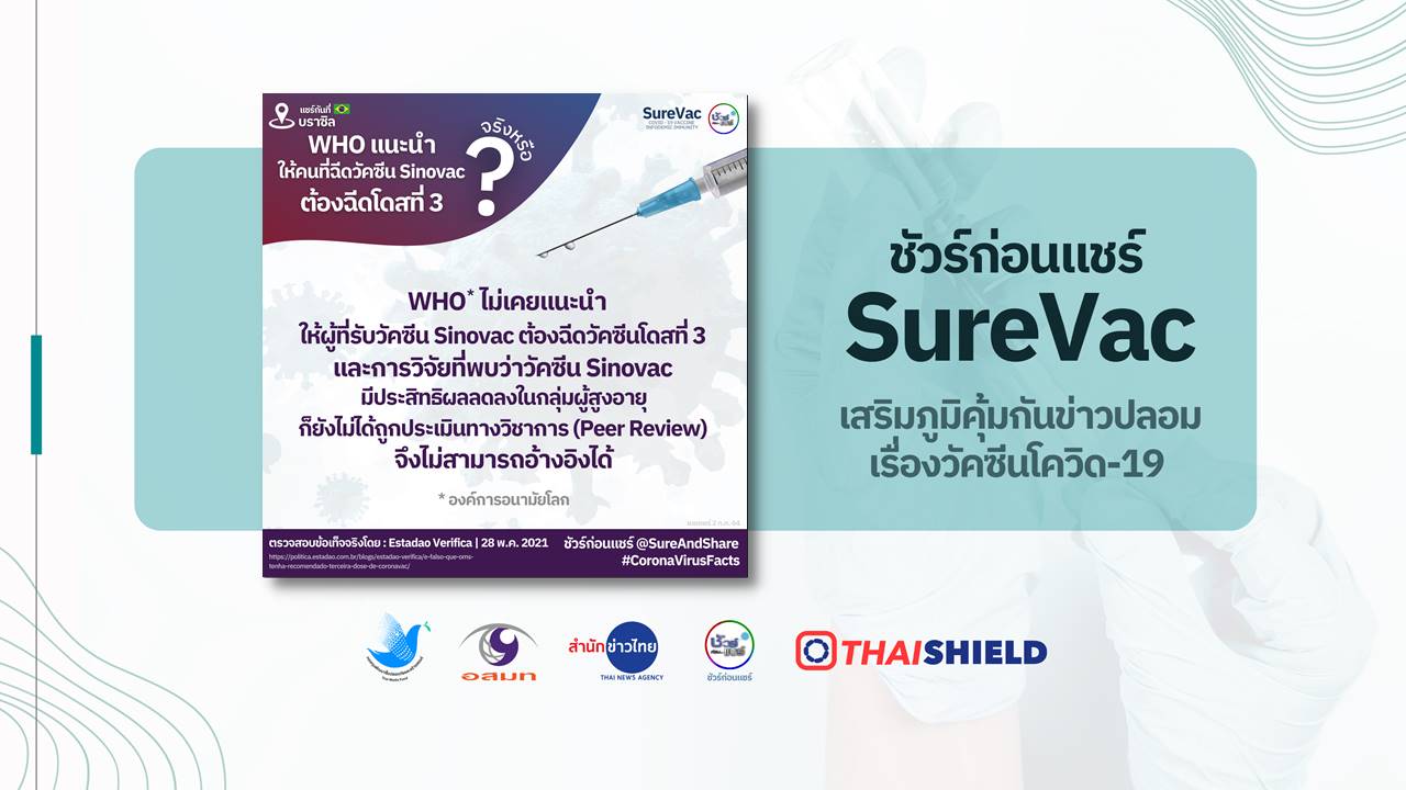 - WHO ไม่เคยแนะนำให้ผู้ที่รับวัคซีน Sinovac ต้องฉีดวัคซีนโดสที่ 3