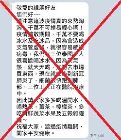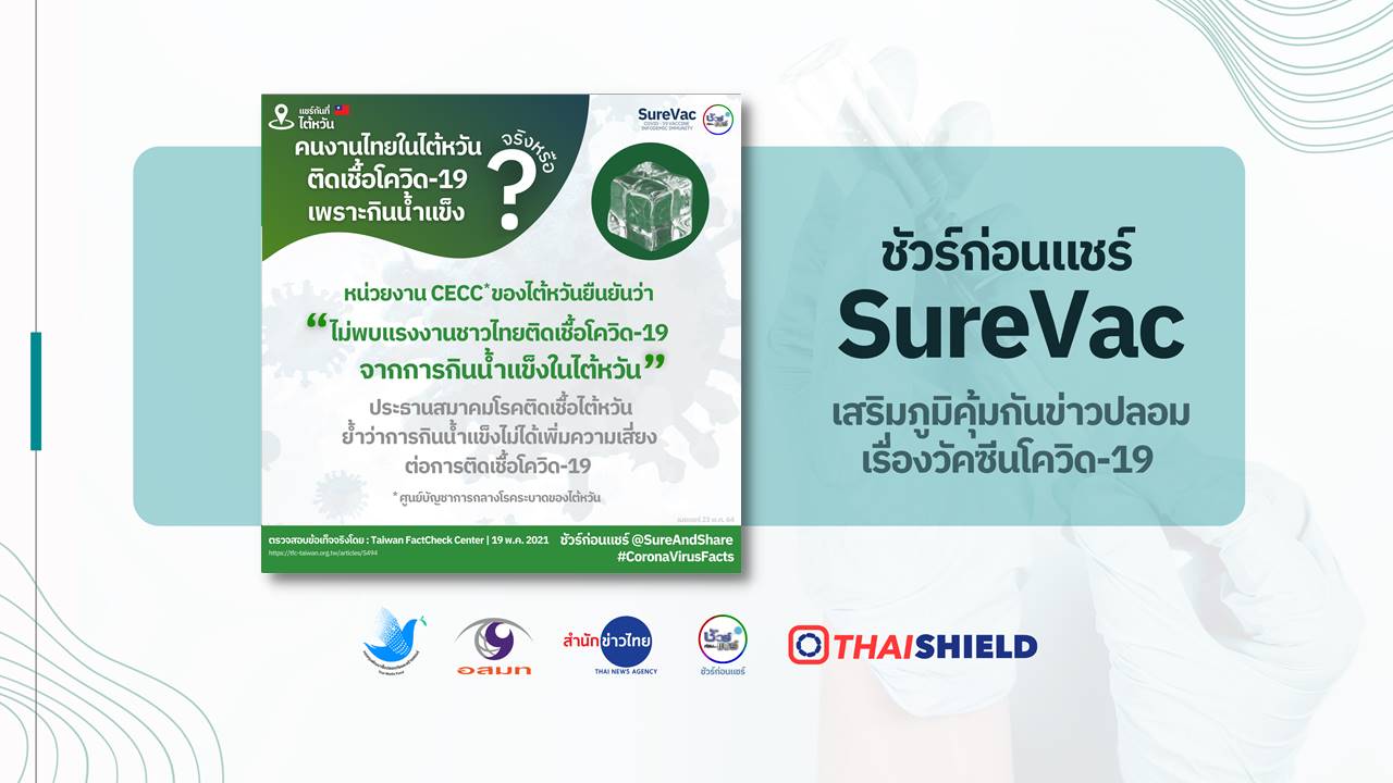 มีข้อมูลเท็จเผยแพร่บนสื่อสังคมออนไลน์ในไต้หวันเมื่อวันที่ 17 พฤษภาคม 2021 โดยผู้โพสต์อ้างว่าตนติดโควิด 19 จากคนงานไทย 3 คน โดยคนงานทั้ง 3 มีนิสัยชอบดื่มน้ำเย็นและกินน้ำแข็งเพื่อคลายร้อนทุกๆ วัน จนตอนนี้ทั้ง 3 คนยังรักษาตัวอยู่ในโรงพยาบาล สาเหตุเป็นเพราะน้ำแข็งทำให้หลอดลมมีปัญหาและเสี่ยงต่อการติดเชื้อโควิด 19 โดยผู้โพสต์เตือนให้ผู้คนระวังการกินน้ำแข็ง และหันมากินน้ำร้อนเพื่อป้องกันการติดเชื้อโควิด 19
