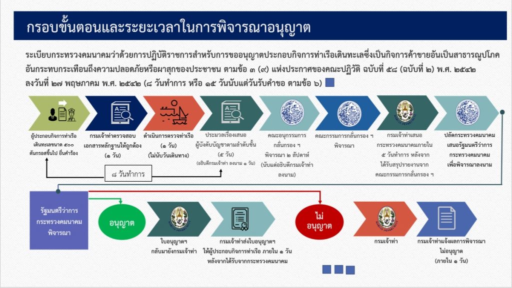 โดยที่ประชุมได้พิจารณากำหนดให้การประชุมคณะกรรมการกลั่นกรองฯ อย่างน้อย 1 ครั้งต่อเดือน และมีมติเห็นชอบกรอบขั้นตอนและระยะเวลาในการพิจารณาอนุญาตตามระเบียบกระทรวงคมนาคมว่าด้วยการปฏิบัติราชการ สำหรับการขออนุญาตประกอบกิจการท่าเรือเดินทะเล ซึ่งเป็นกิจการค้าขายอันเป็นสาธารณูปโภคอันกระทบกระเทือนถึงความปลอดภัยหรือผาสุกของประชาชน กรอบขั้นตอนและระยะเวลาในการพิจารณาอนุญาตตามระเบียบกระทรวงคมนาคมว่าด้วยการปฏิบัติราชการ สำหรับการขออนุญาตเช่าหรือใช้เรืออื่นที่มิใช่เรือไทยในการขนส่งทางทะเล ลงวันที่ 10 สิงหาคม 2532 และกรอบขั้นตอนและระยะเวลาในการพิจารณาอนุญาตตามประกาศกระทรวงคมนาคม เรื่อง กำหนดหลักเกณฑ์ วิธีการ และเงื่อนไขการอนุญาตให้เรือของบุคคลผู้ไม่ต้องด้วยลักษณะ ที่จะถือกรรมสิทธิ์เรือไทยทำการค้าในน่านน้ำไทยตามมาตรา 47 ทวิ แห่งพระราชบัญญัติเรือไทย พุทธศักราช 2481 ด้วย