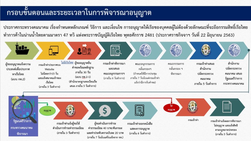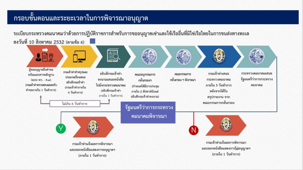 นอกจากนี้ ที่ประชุมพิจารณาเห็นชอบอนุญาตให้เรือของบุคคลผู้ไม่ต้องด้วยลักษณะที่จะถือกรรมสิทธิ์เรือไทยทำการค้าในน่านน้ำไทย ตามมาตรา 47 ทวิ แห่งพระราชบัญญัติเรือไทย พุทธศักราช 2481 จำนวน 4 ลำ เข้ามาประกอบกิจการเฉพาะเท่าที่มีเอกชนร้องขออนุญาต และเป็นการเฉพาะตราบเท่าที่ได้รับการยืนยันจากสมาคมเจ้าของเรือไทย ว่าไม่มีเรือไทย สนใจเข้ามาประกอบกิจการ และเป็นไปตามหลักเกณฑ์ ประกาศ ตาม checklist ที่กฎหมายกำหนดทุกประการ ทั้งนี้ เพื่อให้ การดำเนินการในกิจการต่าง ๆ ตามวัตถุประสงค์แห่งสัญญาการว่าจ้างเรือ ของเอกชน เป็นไปเพื่อประโยชน์สมตามวัตถุประสงค์เท่าที่จำเป็น และคงรักษาประโยชน์ของธุรกิจประกอบกิจการเรือของไทย.-สำนักข่าวไทย