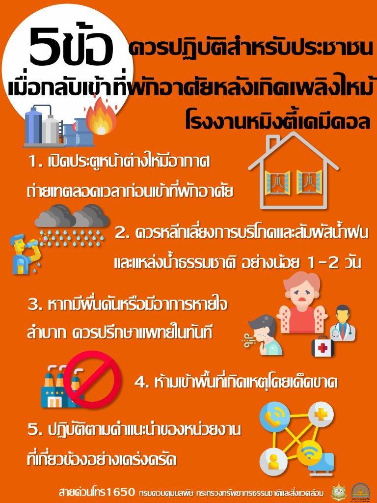 นอกจากนี้ กรมควบคุมมลพิษ ยังออกแนวทางปฏิบัติ 5 ข้อ สำหรับประชาชน หลังจากกลับเข้าบ้านเรือนแล้ว ซึ่งแนะนำให้เปิดประตูหน้าต่างให้มีอากาศถ่ายเทตลอดเวลา ก่อนเข้าที่พักอาศัย หลีกเลี่ยงการบริโภคและสัมผัสน้ำฝน ตลอดจนน้ำจากแหล่งน้ำธรรมชาติ อย่างน้อย 1-2 วัน หากมีผื่นคัน หรือหายใจลำบาก ควรปรึกษาแพทย์ในทันที ห้ามเข้าพื้นที่เกิดเหตุโดยเด็ดขาด รวมทั้งปฏิบัติตามคำแนะนำของหน่วยงานที่เกี่ยวข้องอย่างเคร่งครัด. – สำนักข่าวไทย