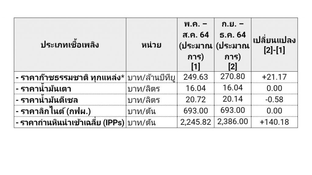 3. ราคาเชื้อเพลิงเฉลี่ยที่ใช้ในการคำนวณค่าเอฟทีเดือน ก.ย. – ธ.ค. 2564 เปลี่ยนแปลงจากการประมาณการในเดือน พ.ค. – ส.ค. 2564 โดยราคาเชื้อเพลิงก๊าซธรรมชาติซึ่งเป็นเชื้อเพลิงหลักในการผลิตไฟฟ้าและราคาถ่านหินนำเข้าเฉลี่ยปรับตัวสูงขึ้นจากประมาณในรอบเดือน พ.ค. – ส.ค. 2564 โดยที่เชื้อเพลิงอื่นๆ ปรับตัวลดลงและคงที่ ดังที่แสดงในตาราง