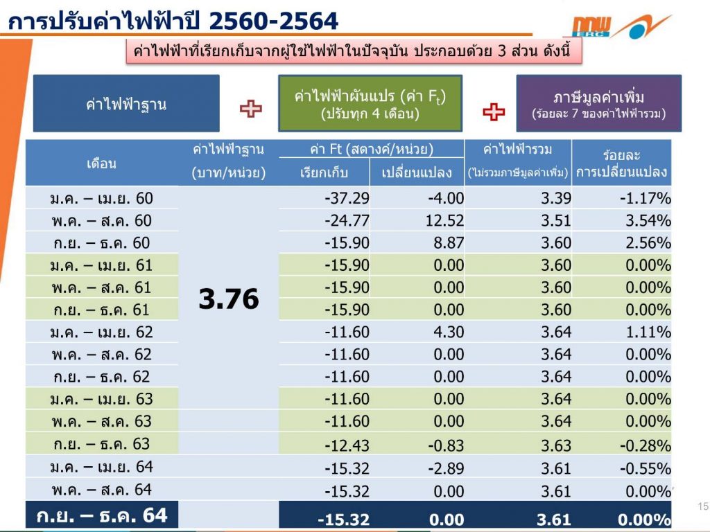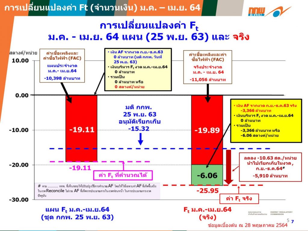 ทั้งนี้กกพ.ได้บริหารจัดการโดยใช้เงินเข้าดูแลค่าไฟฟ้าผันแปร (ค่าเอฟที)ในปี64ไม่ให้ปรับขึ้นแม้ต้นทุนจะสูงขึ้นโดยใช้เงินงวดดูแลงาดสุดท้ายรอบเดือนกันยายน – ธันวาคม 2564ที่ราว1, 700ล้านบาททำให้ค่าไฟฟ้าเอฟทีทั้งปีเรียกเก็บที่ -15.32 สตางค์ต่อหน่วย ส่งผลให้ผู้ใช้ไฟฟ้ายังคงจ่ายค่าไฟฟ้าเท่าเดิมในอัตรา 3.61 บาทต่อหน่วย เมื่อวันที่ 7 กรกฎาคม 2564 คณะกรรมการกำกับกิจการพลังงาน (กกพ.) มีมติให้ตรึงค่าไฟฟ้าผันแปร (ค่าเอฟที) สำหรับงวด4เดือนสุดท้ายของปี64.พร้อมระบุในแถลงการณ์ว่า