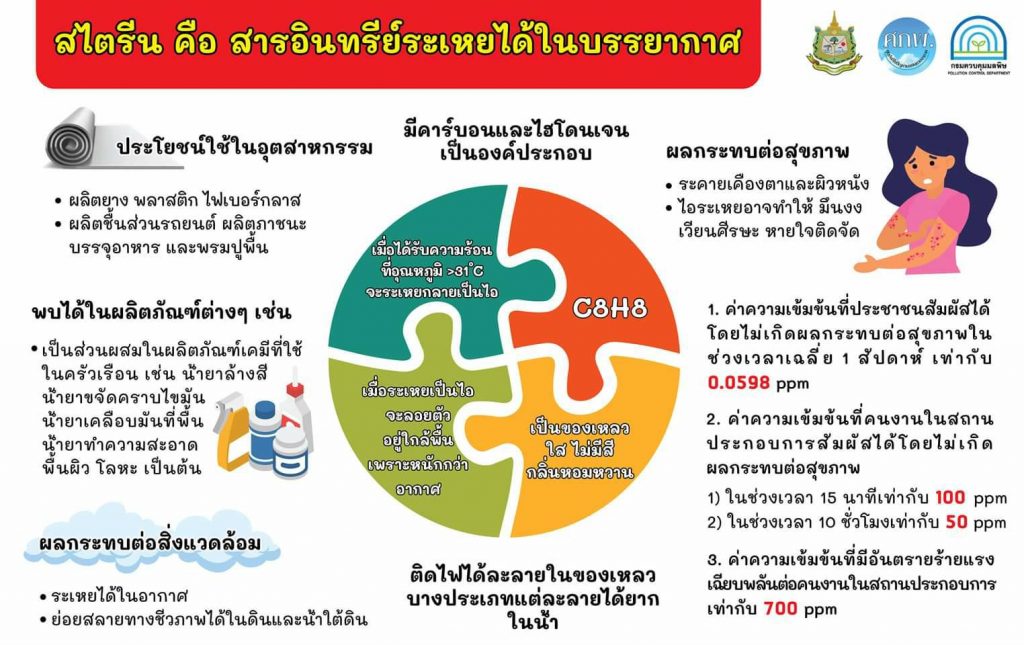 นอกจากนี้ กรมควบคุมมลพิษ ยังเผยแพร่ข้อมูลสไตรีน สำหรับประชาชน โดยระบุว่า สไตรีนเป็นสารอินทรีย์ระเหยได้ มีลักษณะเป็นของเหลว ใส ไม่มีสี กลิ่นหอมหวาน เมื่อได้รับความร้อนที่อุณหภูมิมากกว่า 31 องศาเซลเซียส จะระเหยกลายเป็นไอ แล้วจะลอยตัวอยู่ใกล้พื้น เพราะหนักกว่าอากาศ