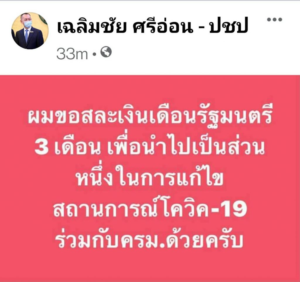 นายเฉลิมชัย ศรีอ่อน รัฐมนตรีว่าการกระทรวงเกษตรและสหกรณ์และเลขาธิการพรรคประชาธิปัตย์กล่าวว่า ขอสละเงินเดือนตำแหน่งรัฐมนตรี 3 เดือนเพื่อนำไปเป็นส่วนหนึ่งในการแก้ไขสถานการณ์โควิด-19 ซึ่งเป็นการร่วมทำกับคณะรัฐมนตรี ซึ่งแม้จะไม่มาก แต่เป็นน้ำใจที่ตั้งใจจะร่วมช่วยเหลือในวิกฤตินี้ ที่ผ่านมาสั่งการให้ทุกหน่วยงานของกระทรวงเกษตรและสหกรณ์บริหารจัดการผลผลิตทางการเกษตรทุกชนิดและหาตลาดทั้งในและต่างประเทศเพื่อให้เกษตรกรจำหน่ายได้ รวมถึงการเพิ่มมูลค่าสินค้า ซึ่งจะทำให้มีรายได้สม่ำเสมอ