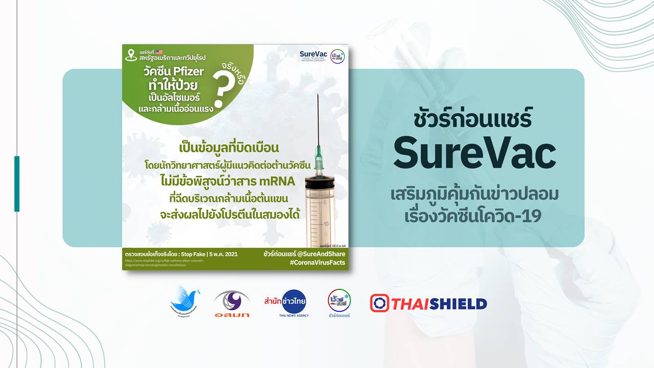 - ไม่มีข้อพิสูจน์ว่าสาร mRNA ที่ฉีดบริเวณกล้ามเนื้อต้นแขน จะส่งผลไปยังโปรตีนในสมองได้
