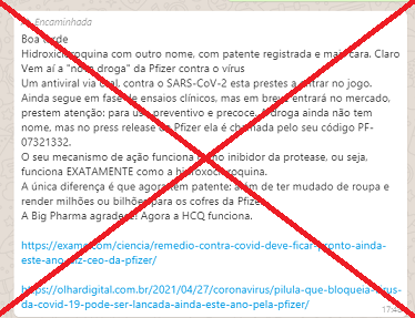 มีข้อมูลเท็จเผยแพร่ทาง WhatsApp ในประเทศบราซิล โดยอ้างว่า Pfizer หนึ่งในบริษัทผู้ผลิตวัคซีนโควิด 19 เตรียมจำหน่ายยาต้านไวรัสโควิด 19 ซึ่งมีคุณสมบัติยับยั้งการสร้างโปรตีนของไวรัสแบบเดียวกับ Hydroxychloroquine แม้ Hydroxychloroquine จะไม่เป็นที่ยอมรับจากองค์การอนามัยโลก (WHO) ในฐานะยารักษาโรคโควิด 19 แต่มันกำลังจะเป็นที่ยอมรับเมื่อถูกจำหน่ายโดยบริษัทยายักษ์ใหญ่ และ Pfizer ก็จะทำเงินมหาศาลจากการขายยา Hydroxychloroquine รูปแบบใหม่ในราคาที่แพงกว่าเดิม