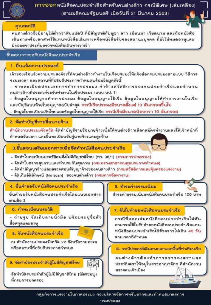 นายเฉลิมชัย ศรีอ่อน รัฐมนตรีว่าการกระทรวงเกษตรและสหกรณ์เปิดเผยว่า สั่งการให้กรมประมงต่ออายุหนังสือคนประจำเรือ (Seabook เล่มเหลือง) ให้แรงงานต่างด้าวที่ได้รับหนังสือคนประจำเรือออกไปอีก 1 ปี นับแต่วันที่หนังสือคนประจำเรือเดิมสิ้นอายุ ตามที่ครม. มีมติให้ดำเนินการได้เป็นกรณีพิเศษ ล่าสุดกรมประมงรายงานว่า ประชุมร่วมกับสำนักงานประมงจังหวัดชายทะเล สมาคมการประมงชายทะเลในพื้นที่ทั้ง 22 จังหวัด และสมาคมการประมงแห่งประเทศไทยแล้ว เพื่อแก้ปัญหาขาดแคลนแรงงานจากสถานการณ์การแพร่ระบาดของโรคโควิด-19 ที่ทำให้นายจ้างหรือผู้รับอนุญาตให้นำคนต่างด้าวมาทำงานซึ่งยื่นขอรับบัญชีรายชื่อความต้องการจ้างแรงงานต่างด้าวไว้กับกระทรวงแรงงาน (Name list) ไม่สามารถดำเนินการขอตรวจลงตราขอรับใบอนุญาตทำงาน (Work Permit) และขอจัดทำหรือปรับปรุงทะเบียนประวัติแรงงานที่ไม่มีสัญชาติไทยได้ทัน ส่งผลให้หนังสือคนประจำเรือที่กำหนดให้มีอายุเท่ากับใบอนุญาตทำงานตามกฎหมายว่าด้วยการบริหารจัดการทำงานของคนต่างด้าวหมดอายุลงไปด้วย จึงส่งผลกระทบต่อการออกทำการประมง