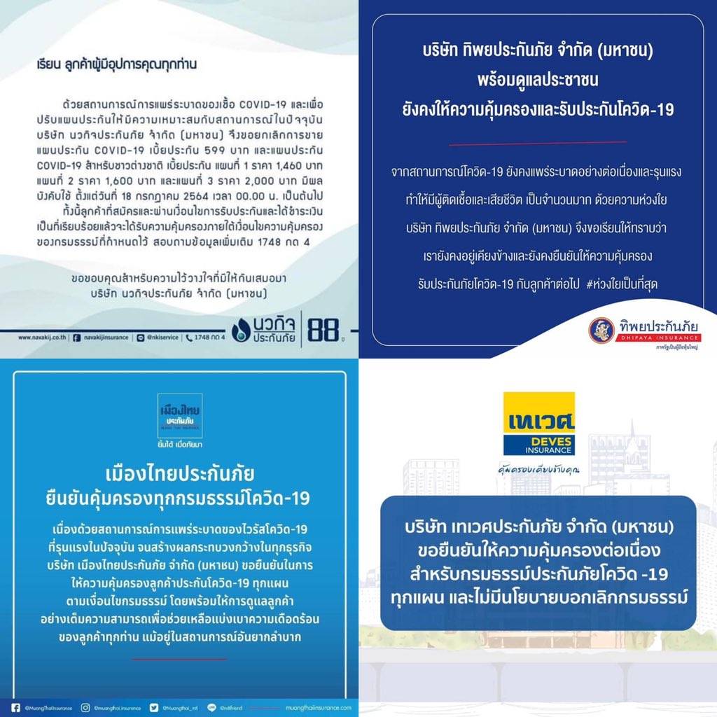 ส่วนบริษัทอื่นๆ ได้มีการโพสต์ข้อมูลส่วนใหญ่ ยังไม่ยกเลิก เช่น บริษัท เมืองไทยประกันภัย จำกัด (มหาชน) ยืนยันในการให้ความคุ้มครองลูกค้าประกันโควิด-19 ทุกแผนตามเงื่อนไขของกรมธรรม์ โดยพร้อมให้การดูแลลูกค้าอย่างเต็มความสามารถ เพื่อช่วยเหลือแบ่งเบาความเดือดร้อนของลูกค้าทุกท่าน ให้อุ่นใจแม้อยู่ในสถานการณ์อันยากลำบาก