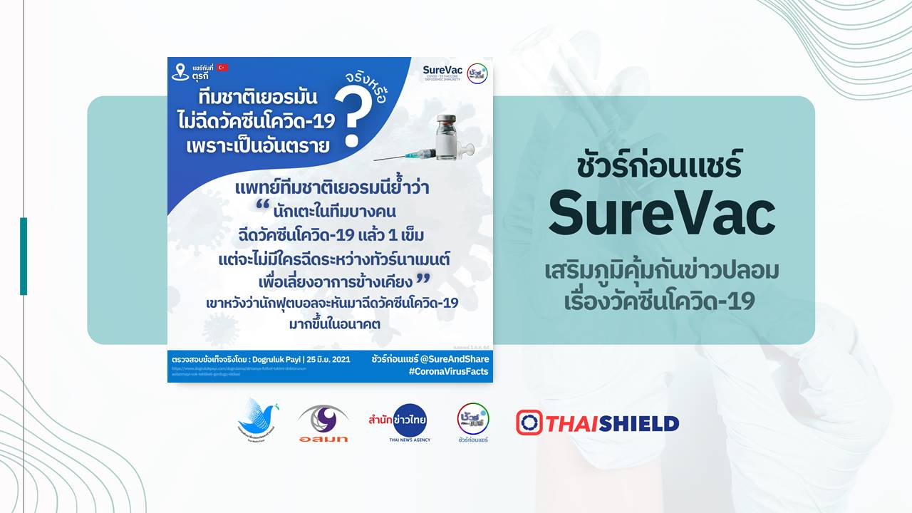 มีข้อมูลเท็จเผยแพร่ผ่านทาง Twitter ในประเทศตุรกี โดยอ้างว่าแพทย์ประจำทีมฟุตบอลทีมชาติเยอรมนี ไม่ยอมให้นักกีฬาเข้ารับการฉีดวัคซีนโควิด 19 ก่อนร่วมการแข่งขันฟุตบอลชิงแชมป์แห่งชาติยุโรป เนื่องจากคิดว่าวัคซีนโควิด 19 เป็นอันตรายต่อนักกีฬา ซึ่งเป็นข้อความที่มีการรีทวิตกว่า 200 ครั้งและมียอดไลท์ 350 ครั้ง